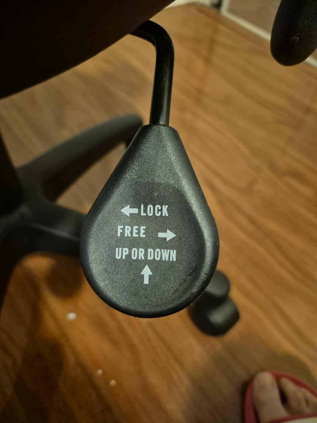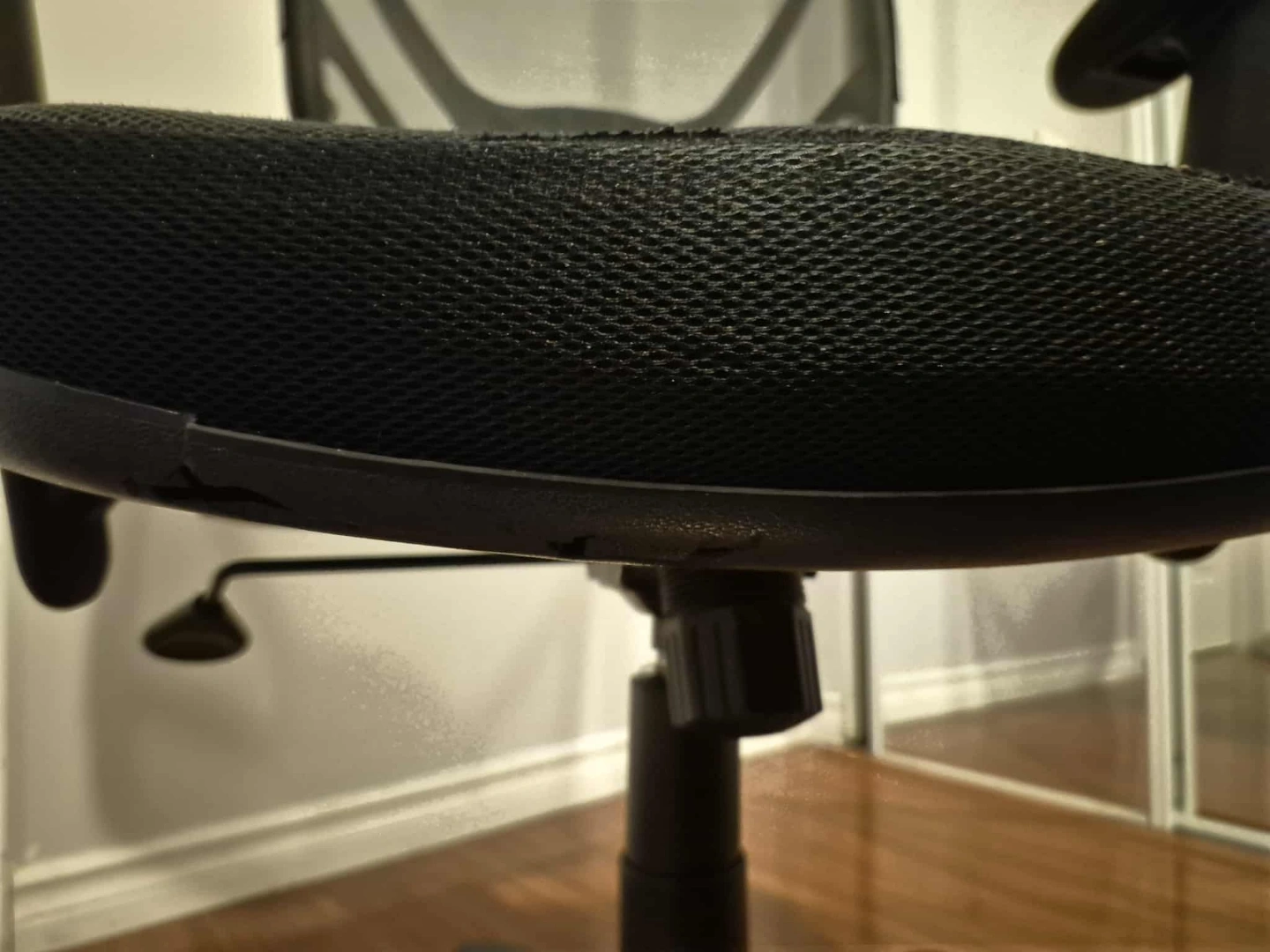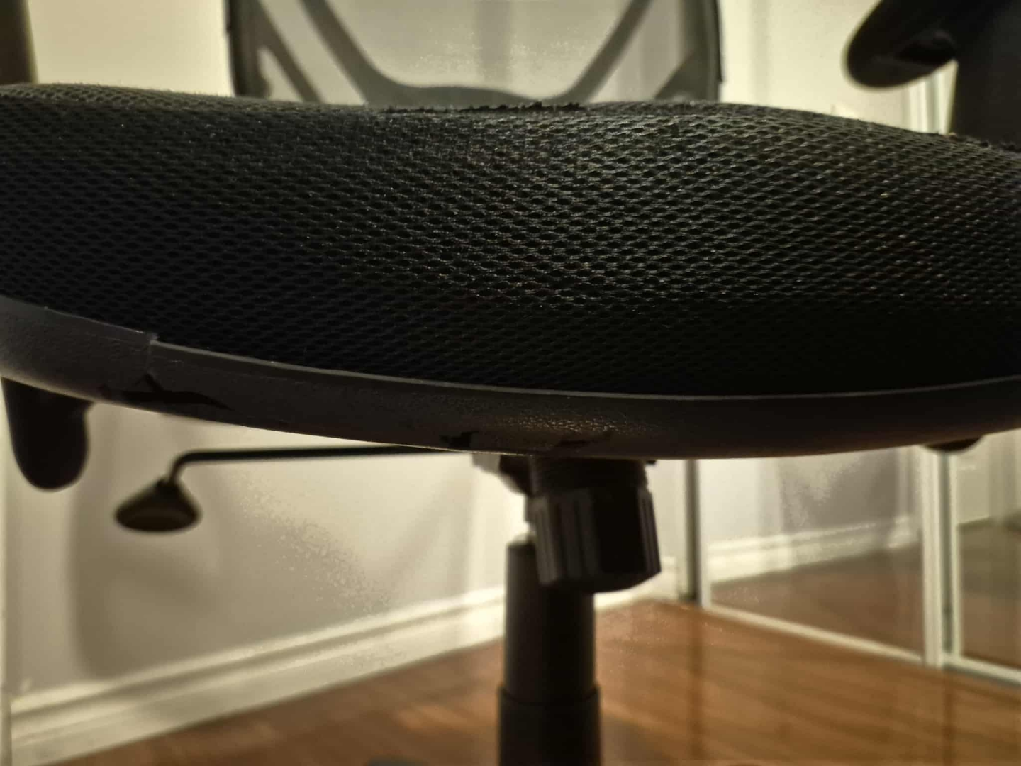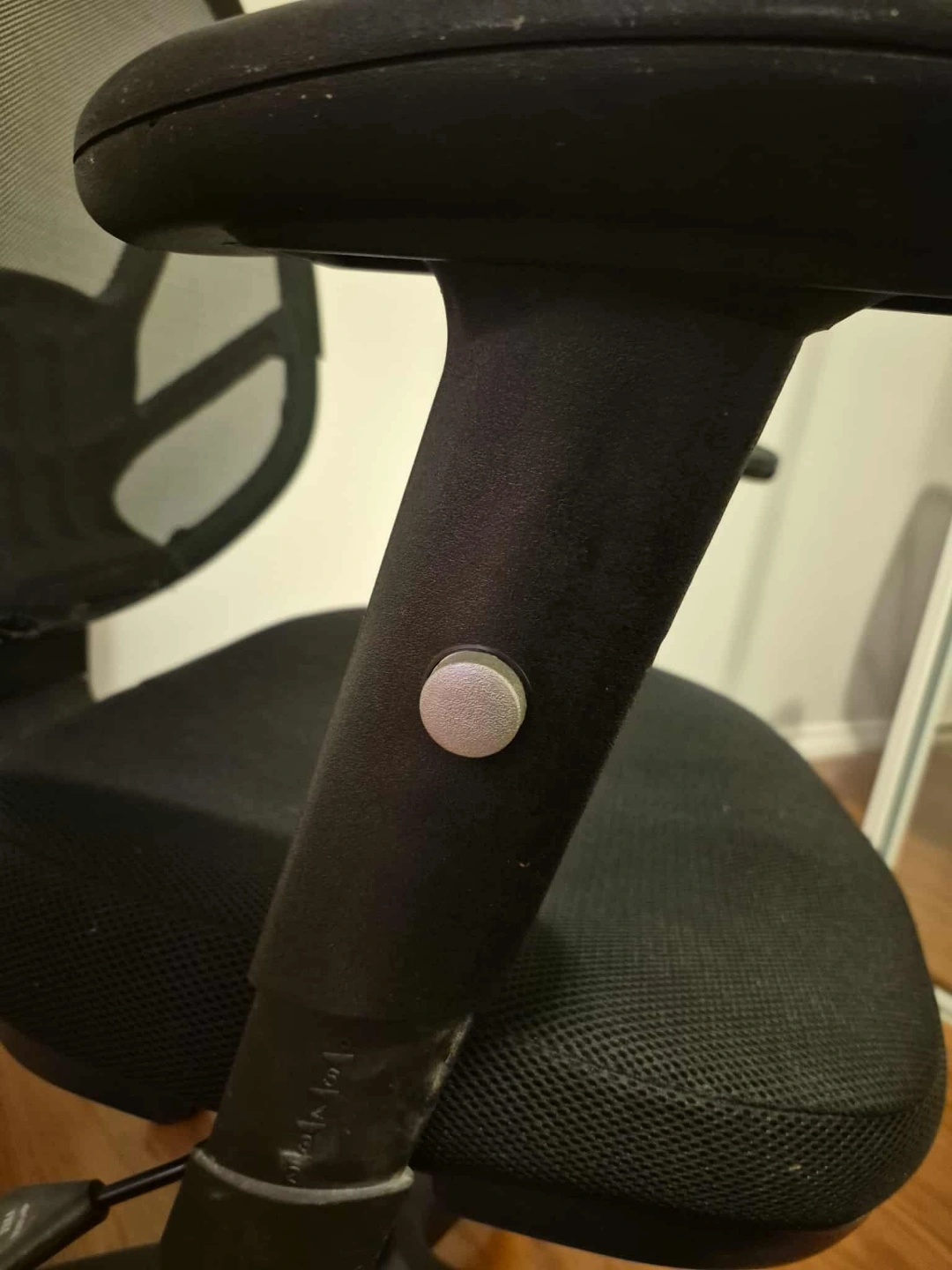 Comfortable office chair, mesh back, black fabric seat. Adjustable height. One armrest shows some cracks. foldable handles with adjustable height.