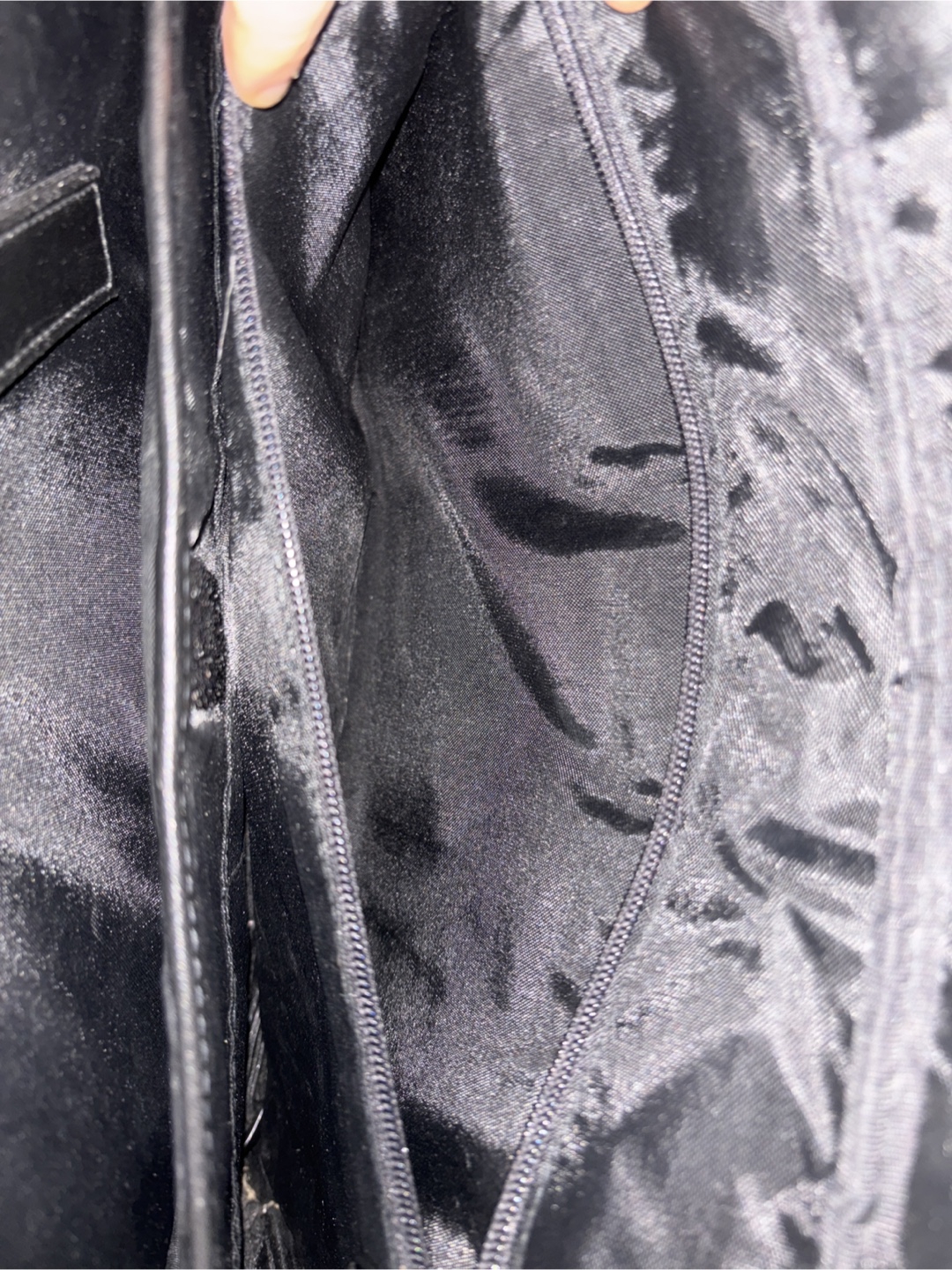 Black leather satchel. Features two top handles, a detachable shoulder strap, and zipper closure. Interior includes multiple compartments. Suitable for travel or business.