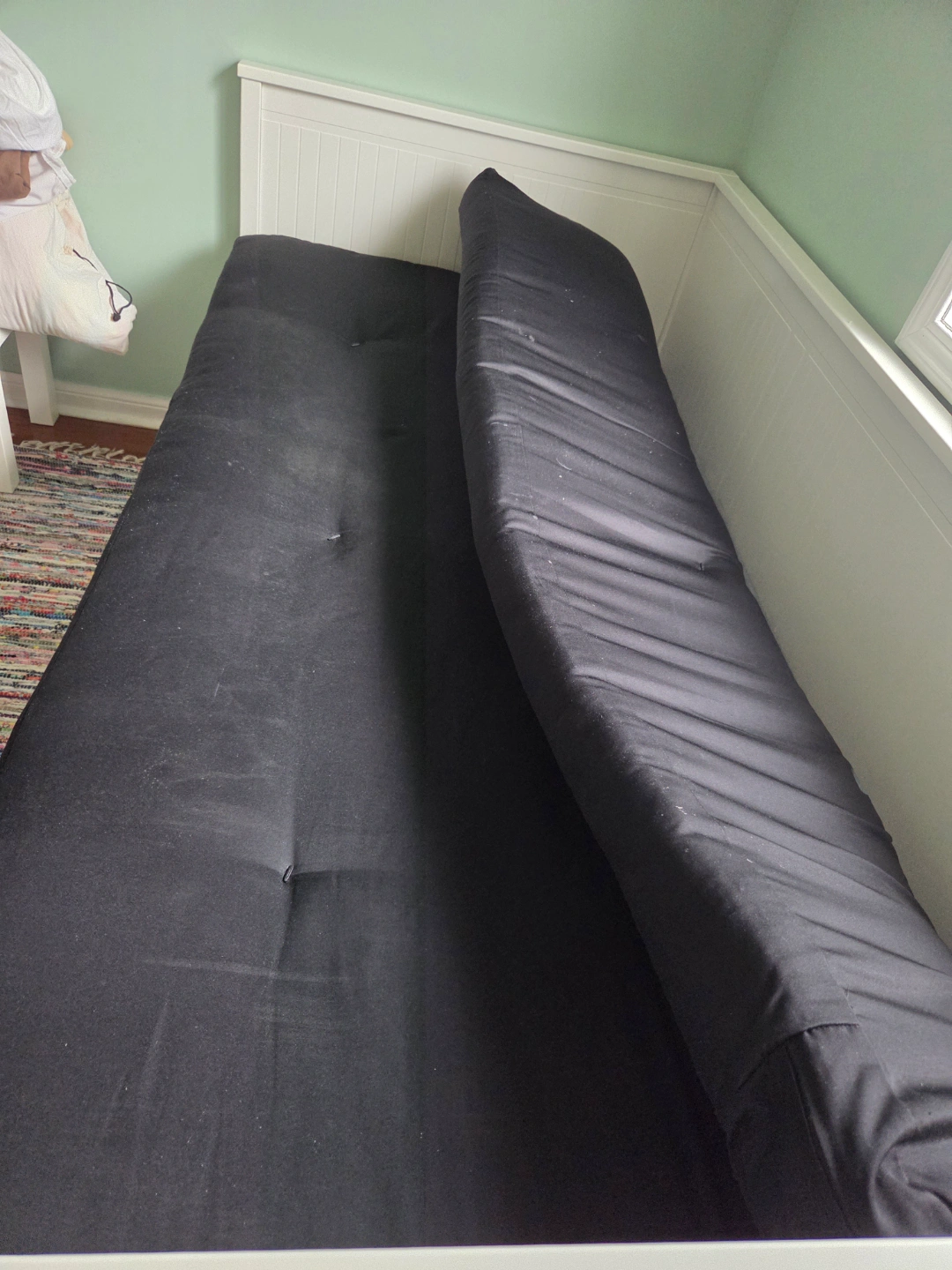 Black double futon mattress, perfect for seating by day and sleeping by night. This used futon mattress has served well and is ready for a new home. It's ideal for students, guest rooms, or anyone needing a space-saving furniture solution.