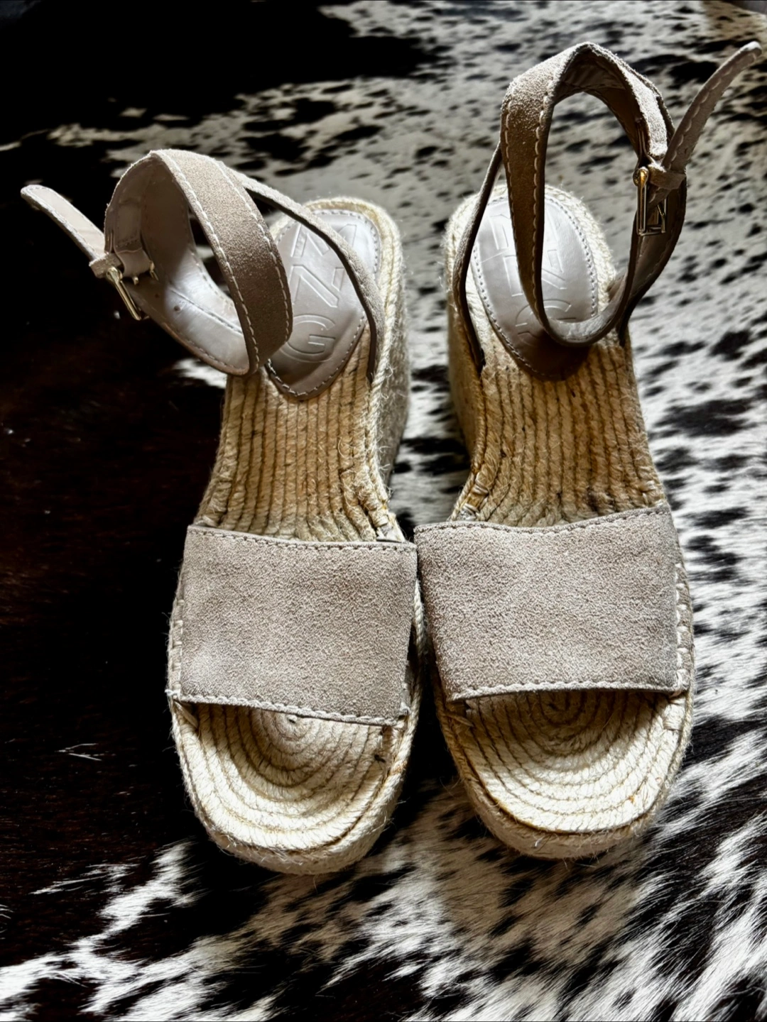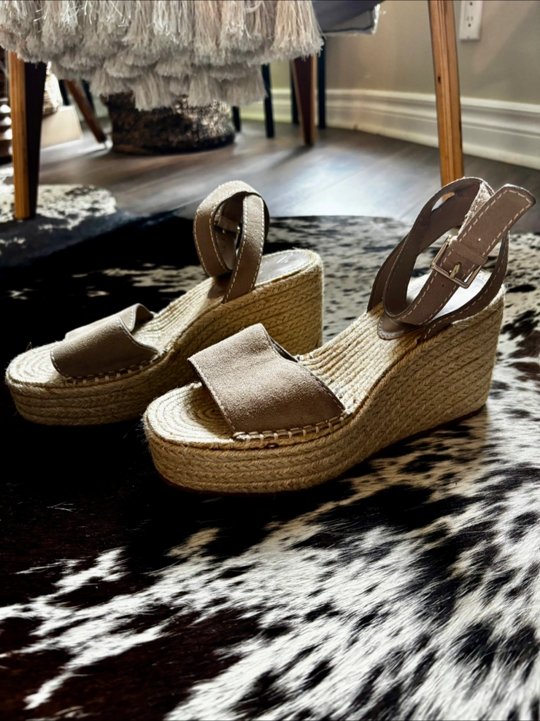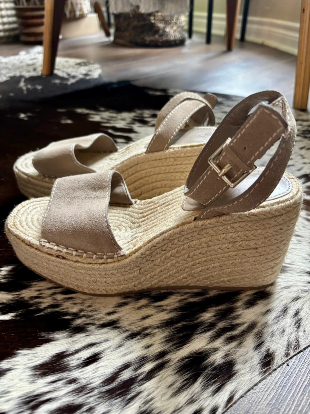 Greyish-Taupe Suede Espadrille Wedge Sandals 6-6.5