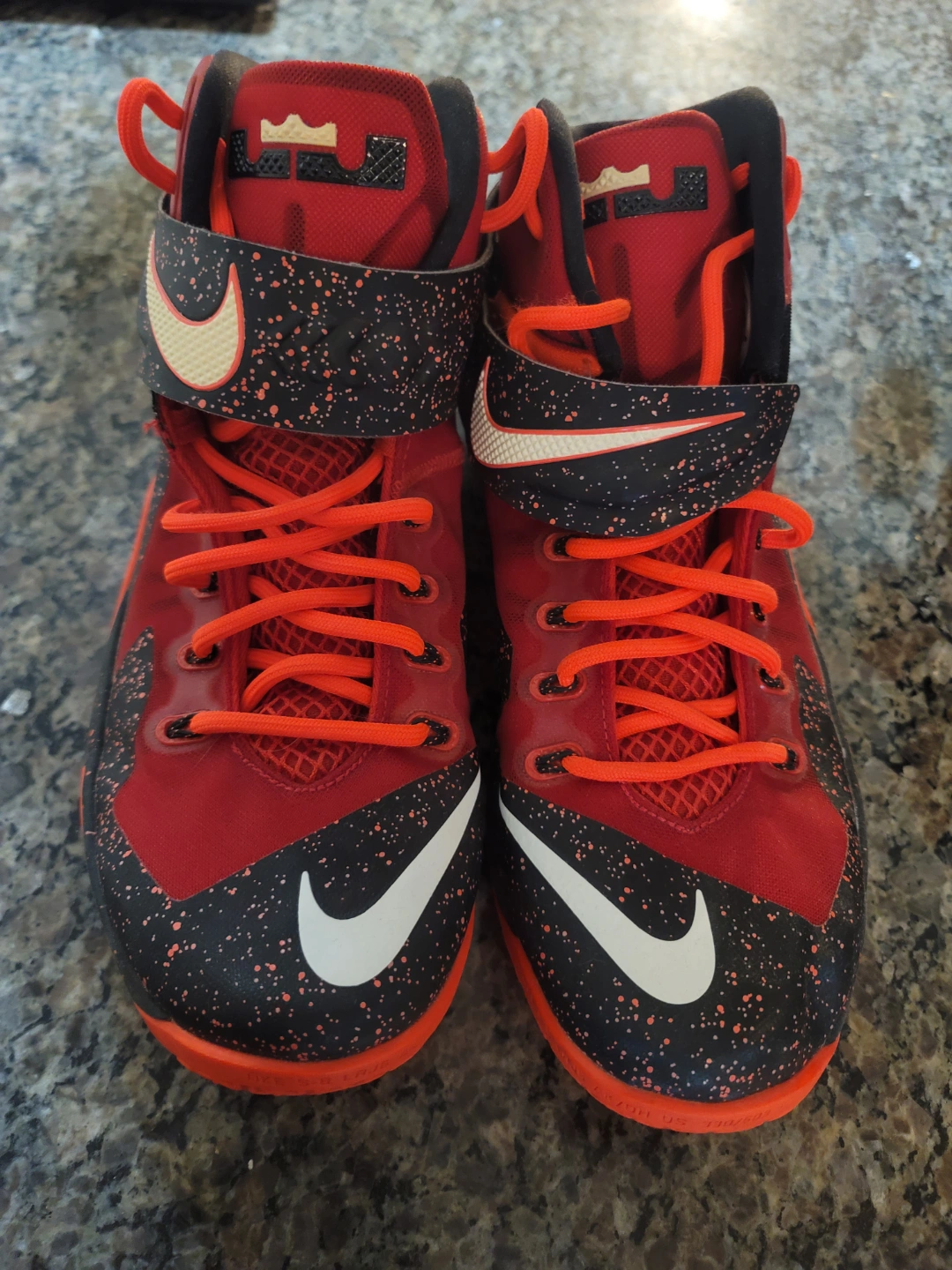 Pre-owned Nike LeBron Soldier VIII basketball shoes. Red and black colourway. High-top design with a strap. Some wear and tear is visible on the soles. Good for casual wear or playing basketball.