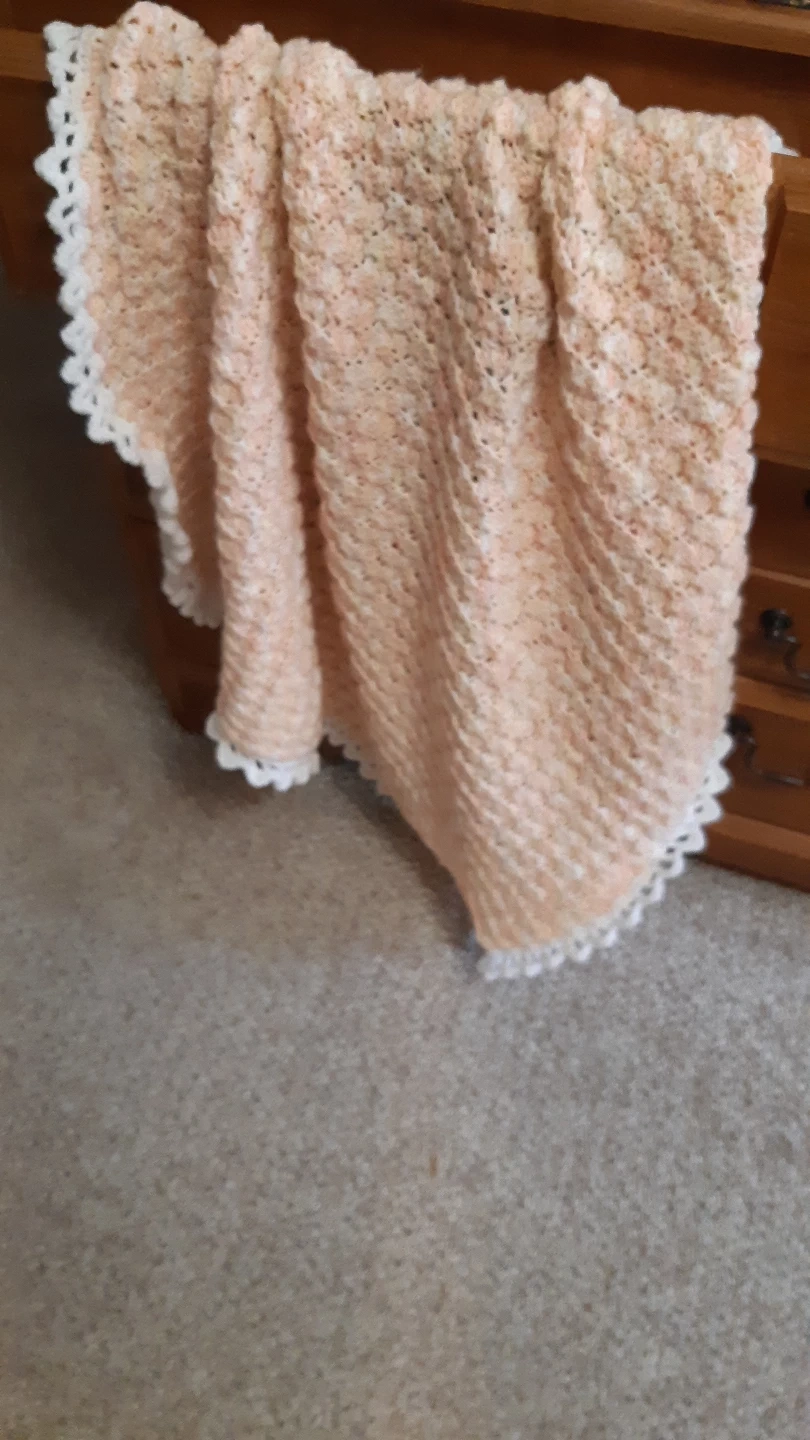 Lovely handmade crochet baby blanket. Peach and white colour scheme. 35" x 37" Soft and cozy. Perfect for a baby shower gift or for your own little one. Features a delicate crocheted border. made by myself. pickup location near Southgate mall
