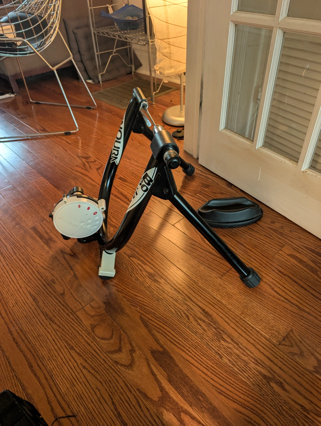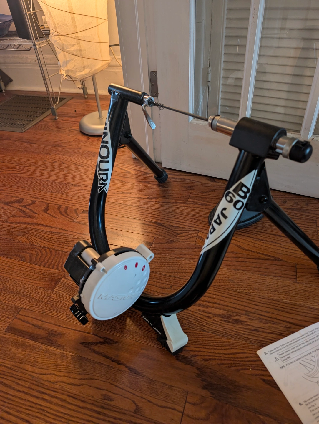 MINOURA B60-D (Non-Remote) bicycle trainer. Good working condition. Broken hub handle, but still functional. Includes front tire rest.