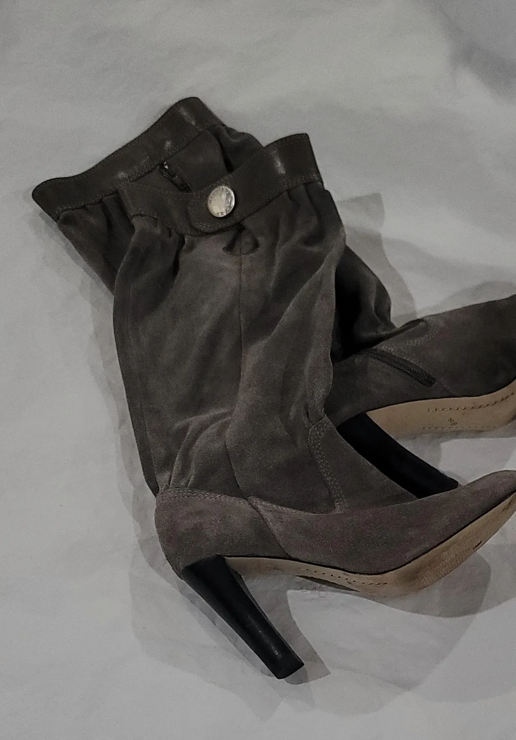 Pair of grey suede knee-high boots. Features a pointed toe and stiletto heel. Zipper closure. Button detail on the shaft.