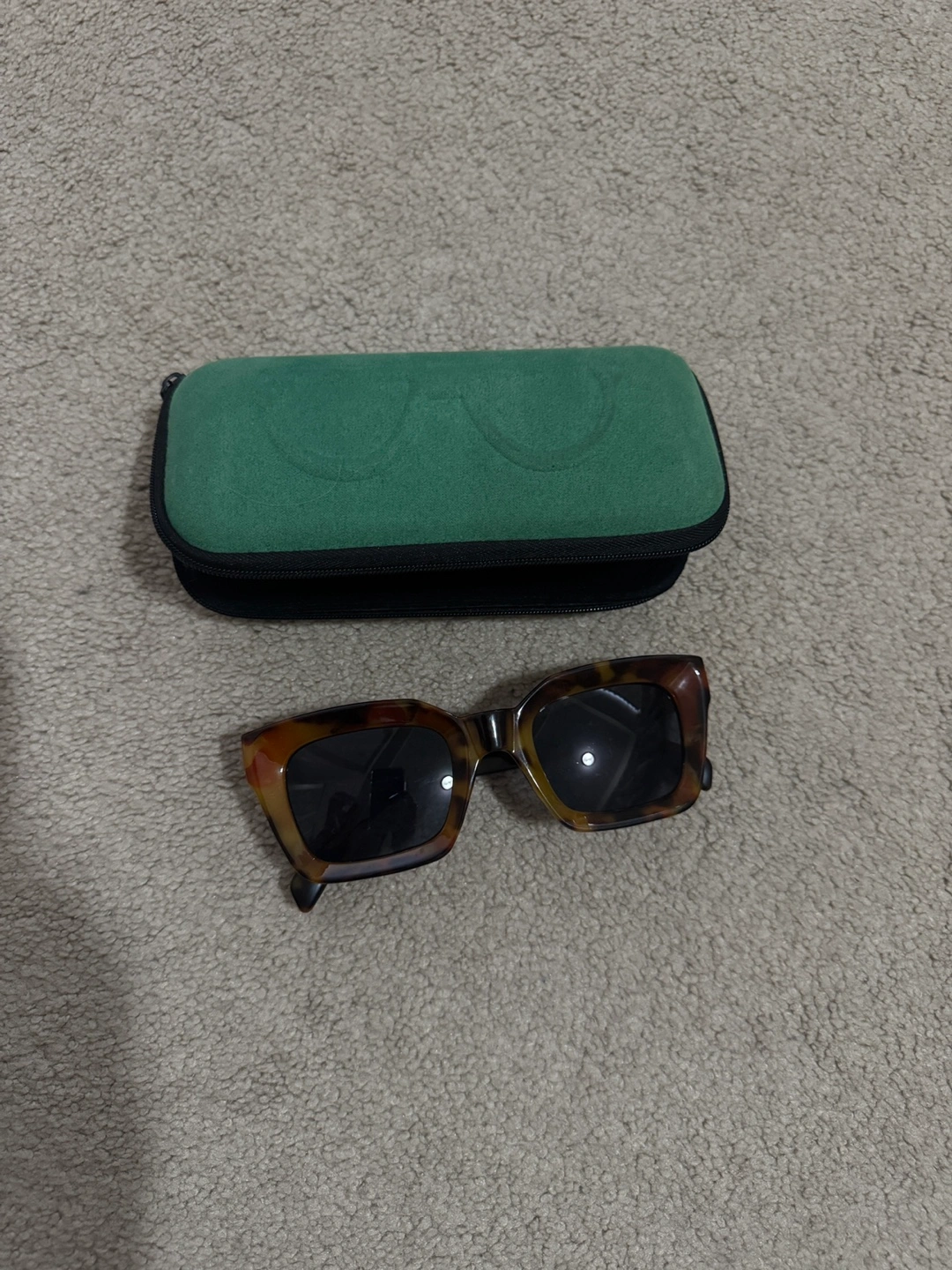Brown tortoise shell square sunglasses. Includes a soft green carrying case. Great for summer. Comes with a case. Pick up in mid or downtown.