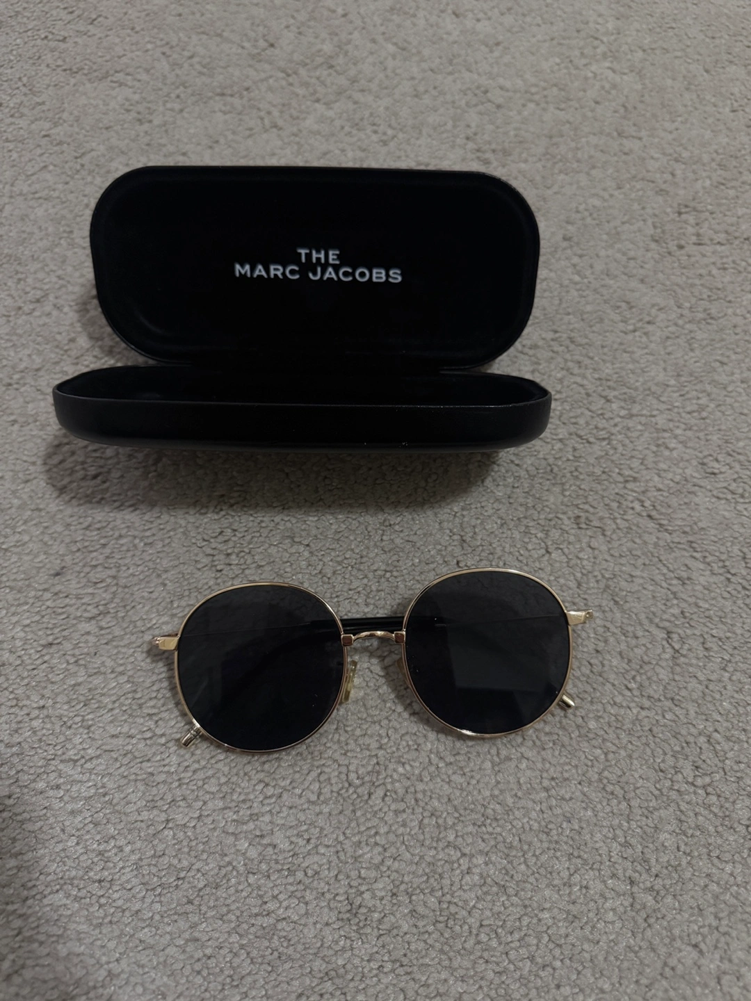Round gold-framed sunglasses. Black lenses. Comes with a hard case. Excellent condition.