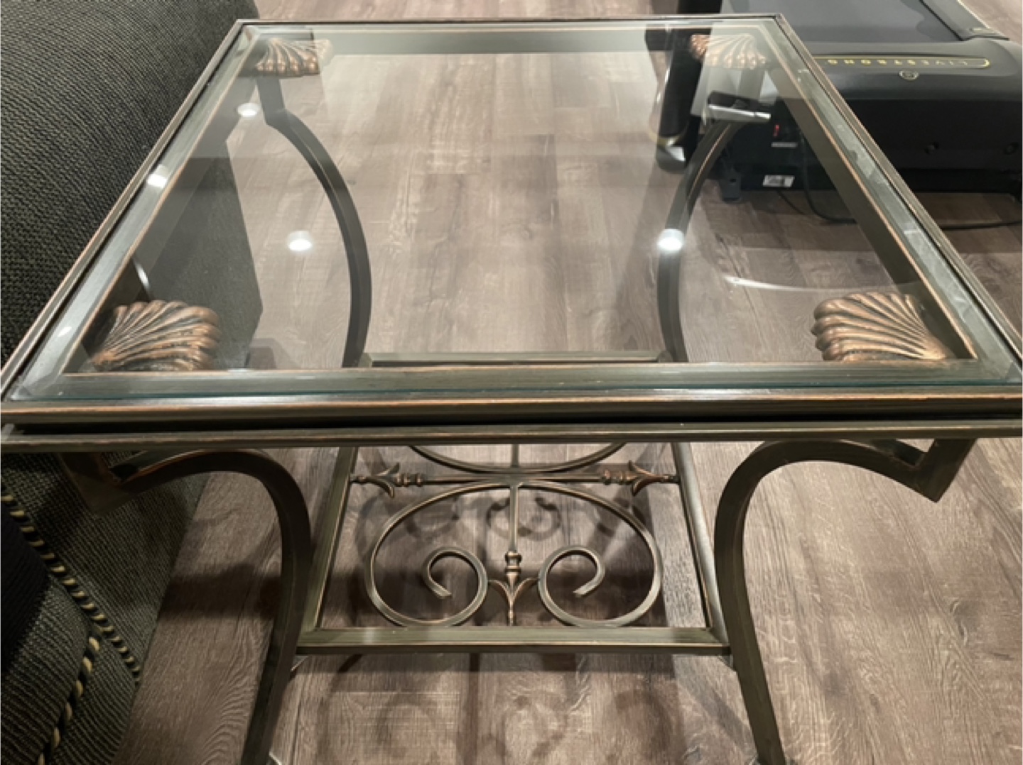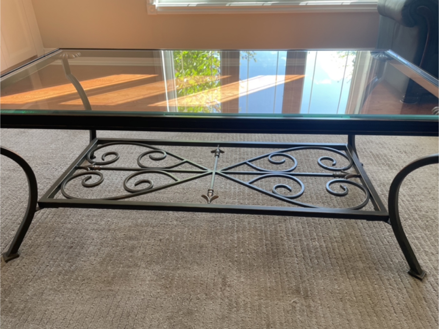 Elegant and sturdy glass coffee table with a beautiful wrought iron base.