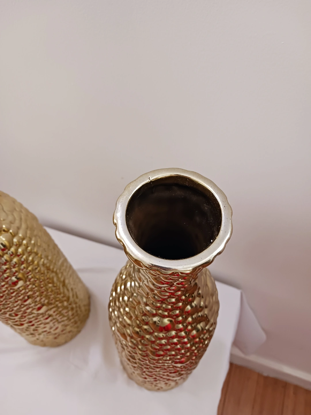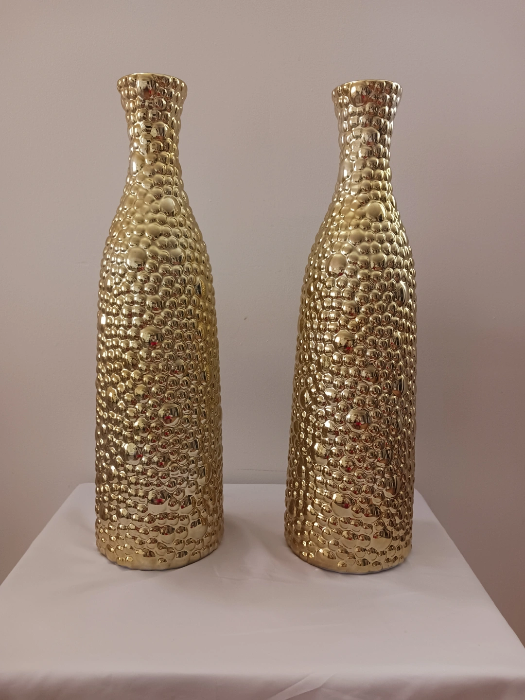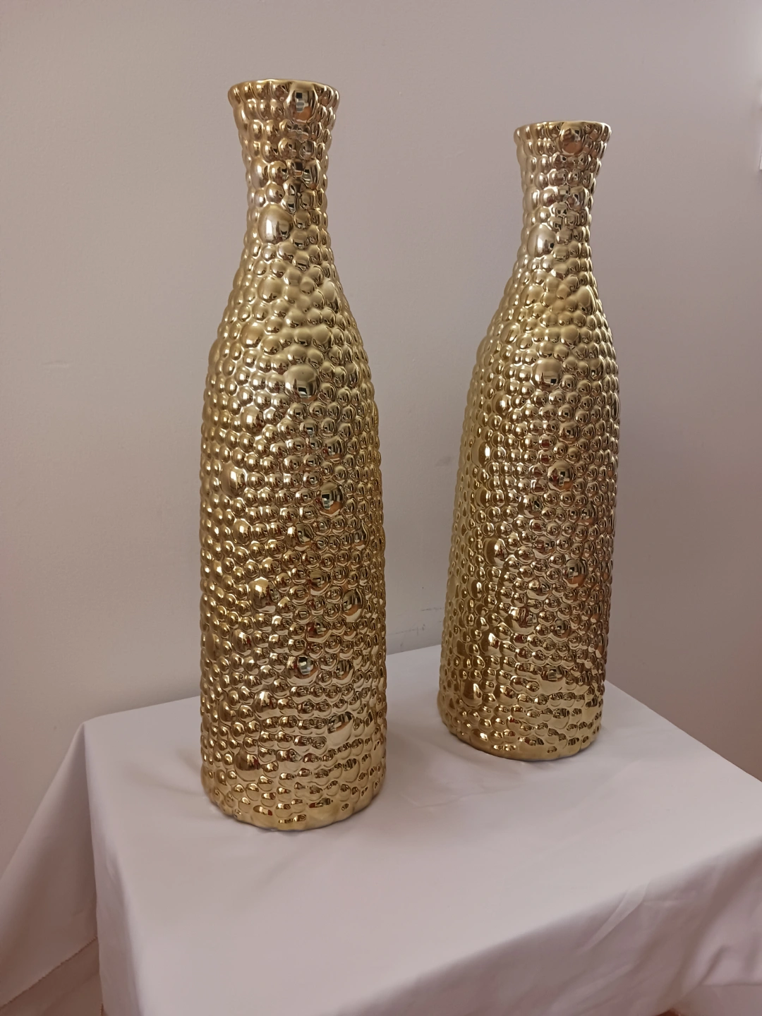 Set of two tall gold ceramic vases with a bubble texture design. In good condition and perfect for home decor. Great for shelves, tables, entryways, or accent spaces. Can be displayed together or separately.