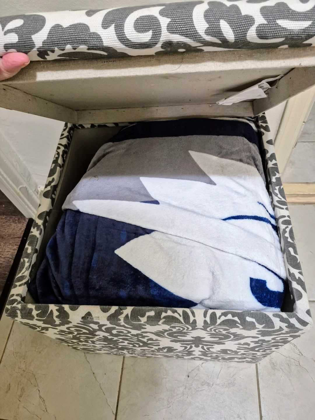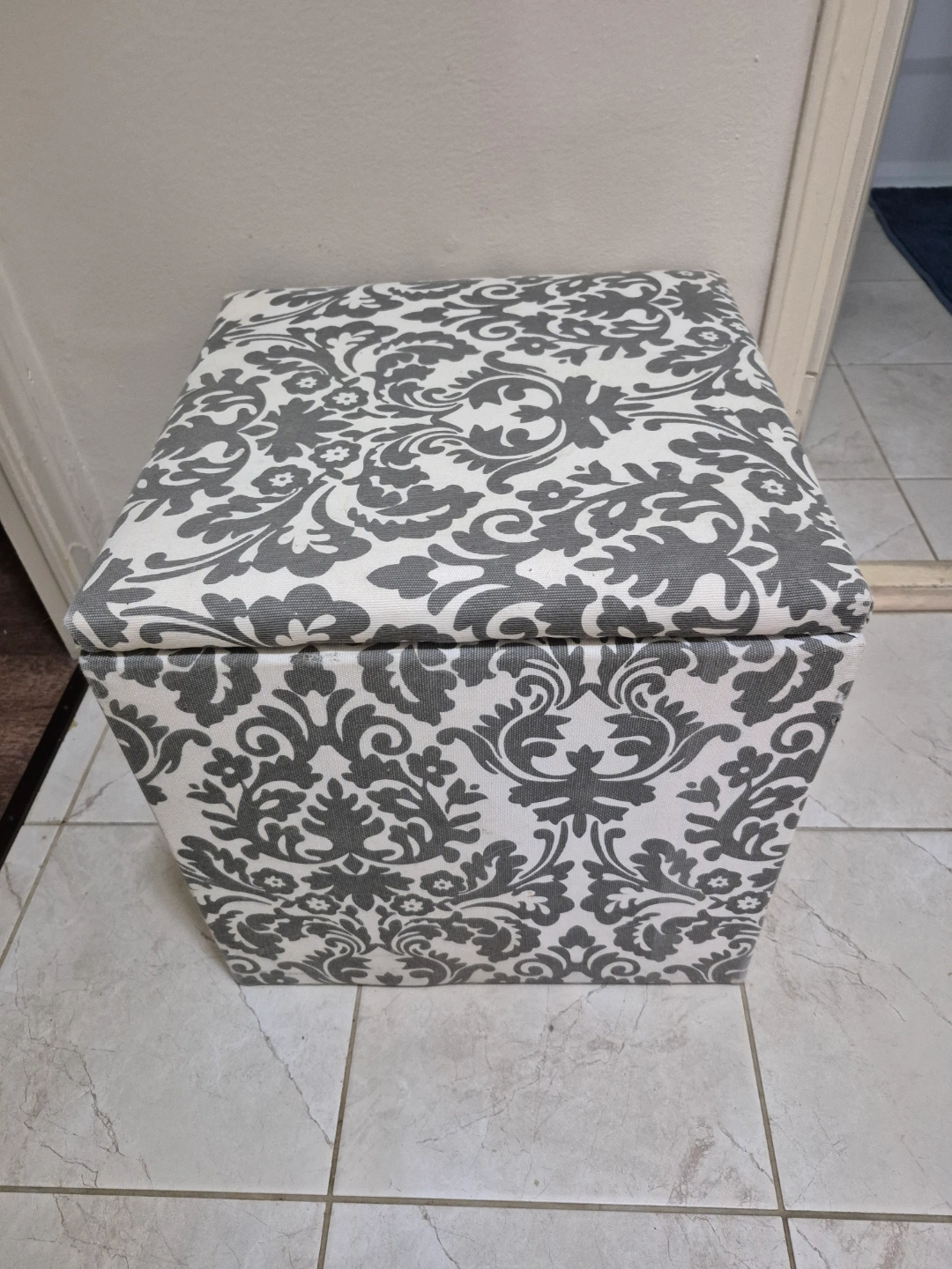 Square storage ottoman. Top lifts to reveal storage space inside. Grey and white damask pattern fabric. Perfect for extra seating and storage.