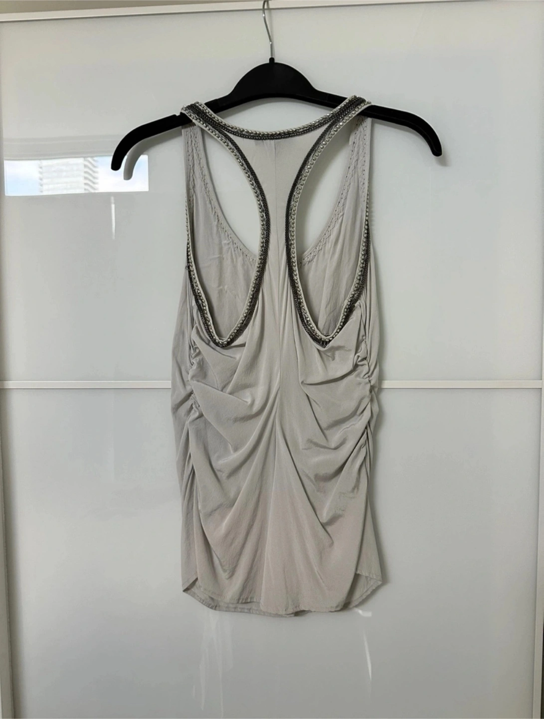 The tank has sequinned trim along the neckline and ruching along both sides. Great to wear for going out.
