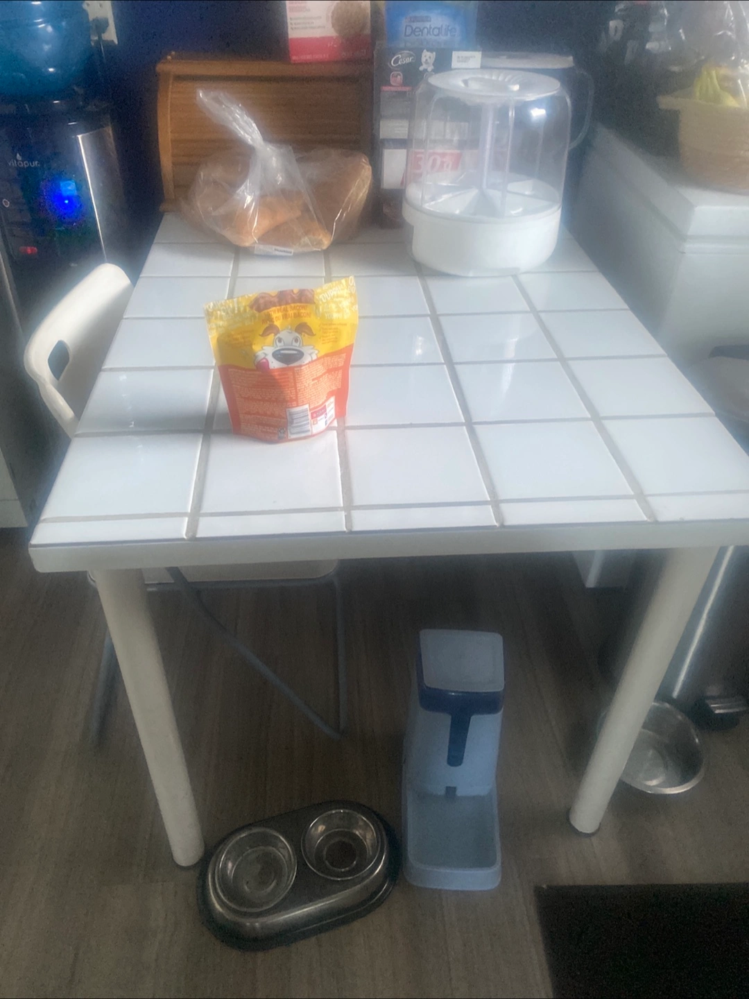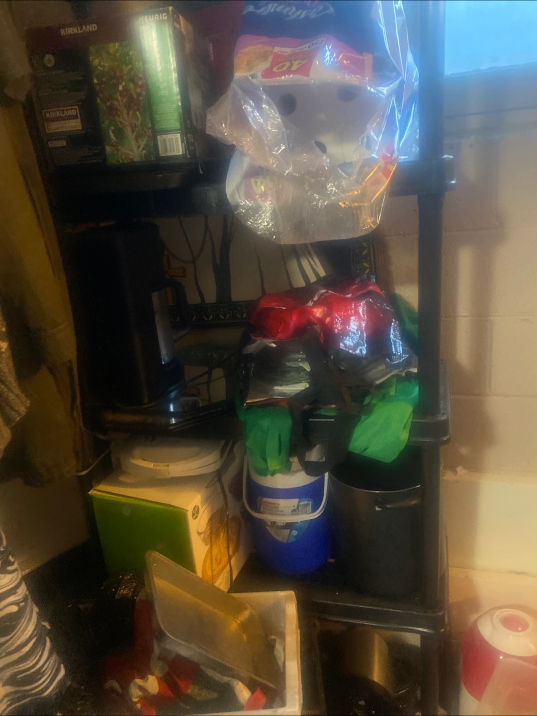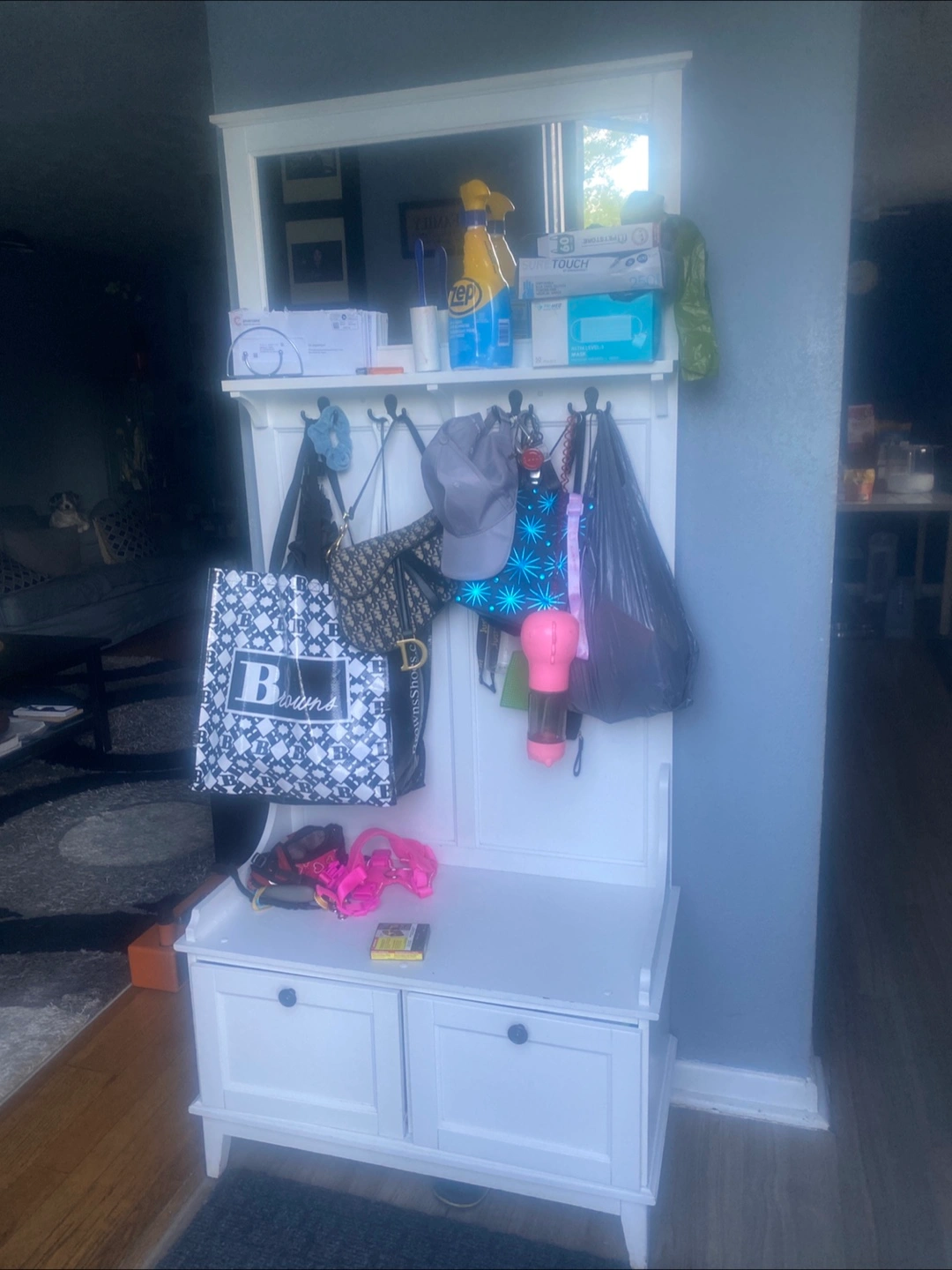White hall tree with mirror and storage. Features coat hooks and lower storage. Also, a white kitchen cabinet with shelves, drawer, and double doors. Both in used condition.