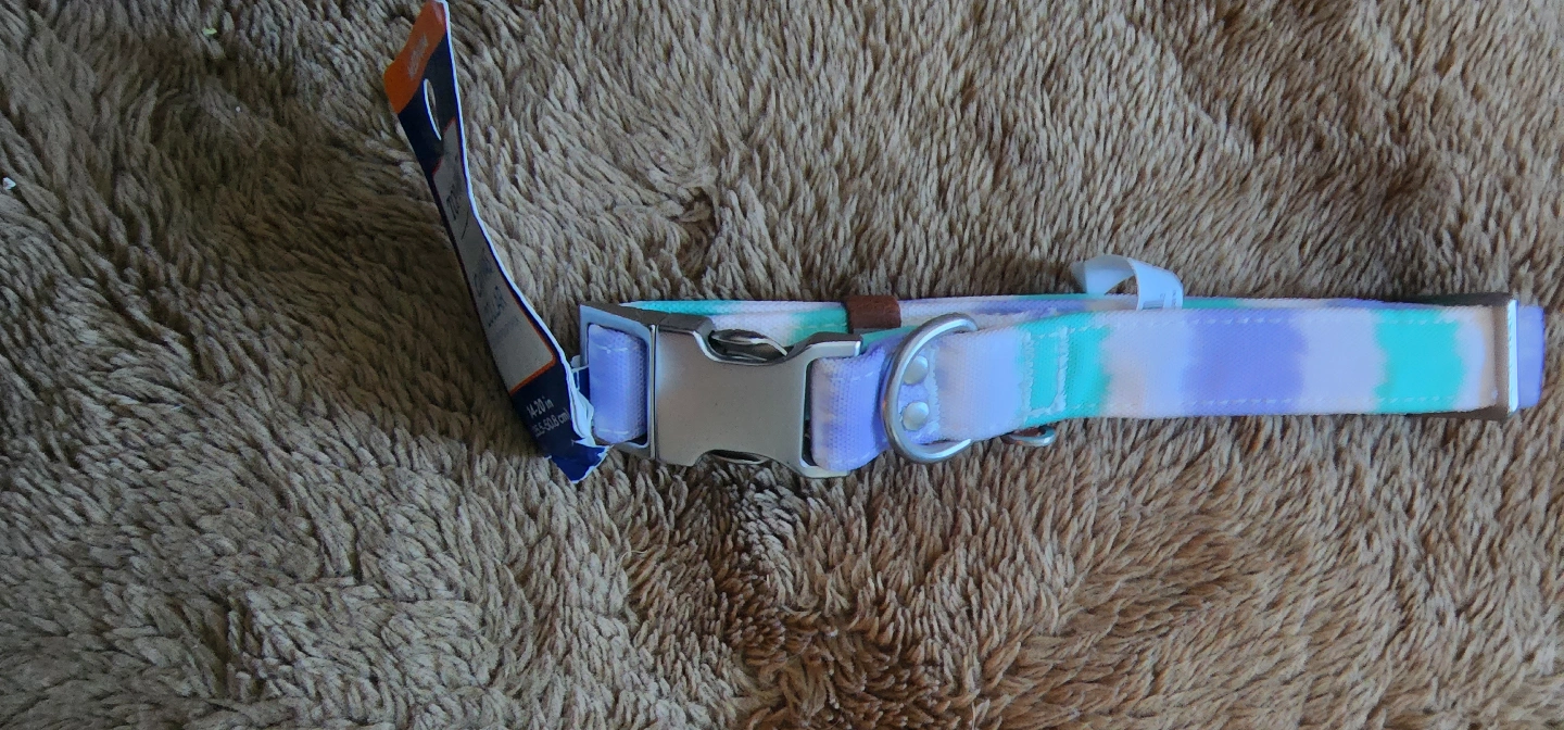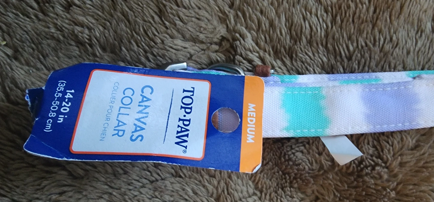 New Top Paw brand dog collar. Medium size, 14-20 inches. Purple, teal and white striped canvas material. Metal buckle.