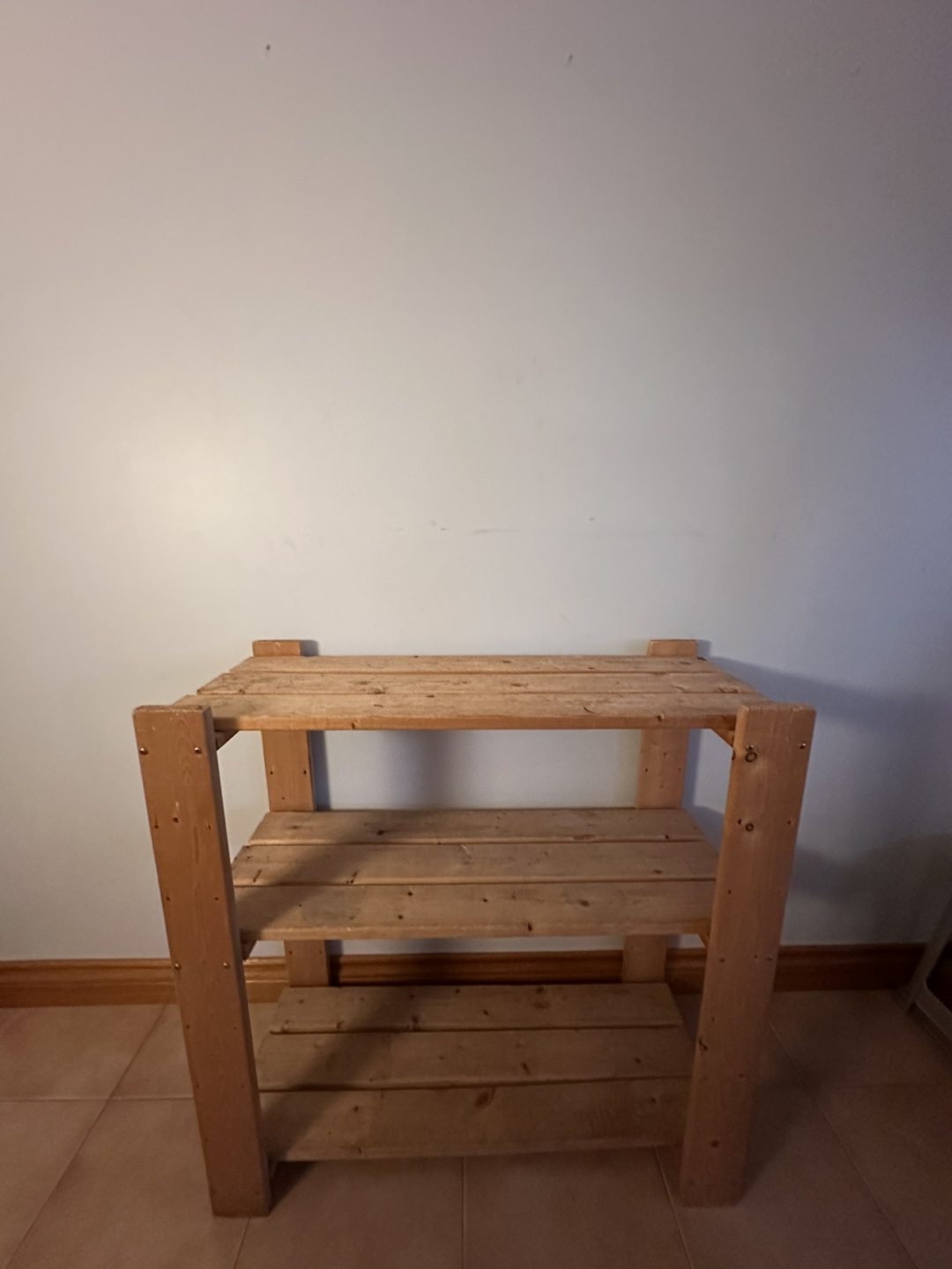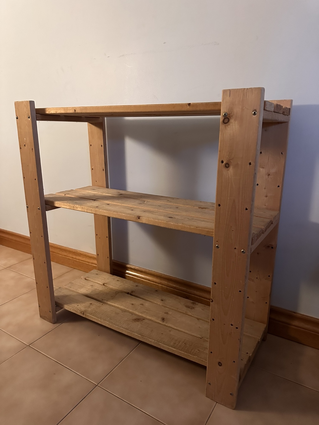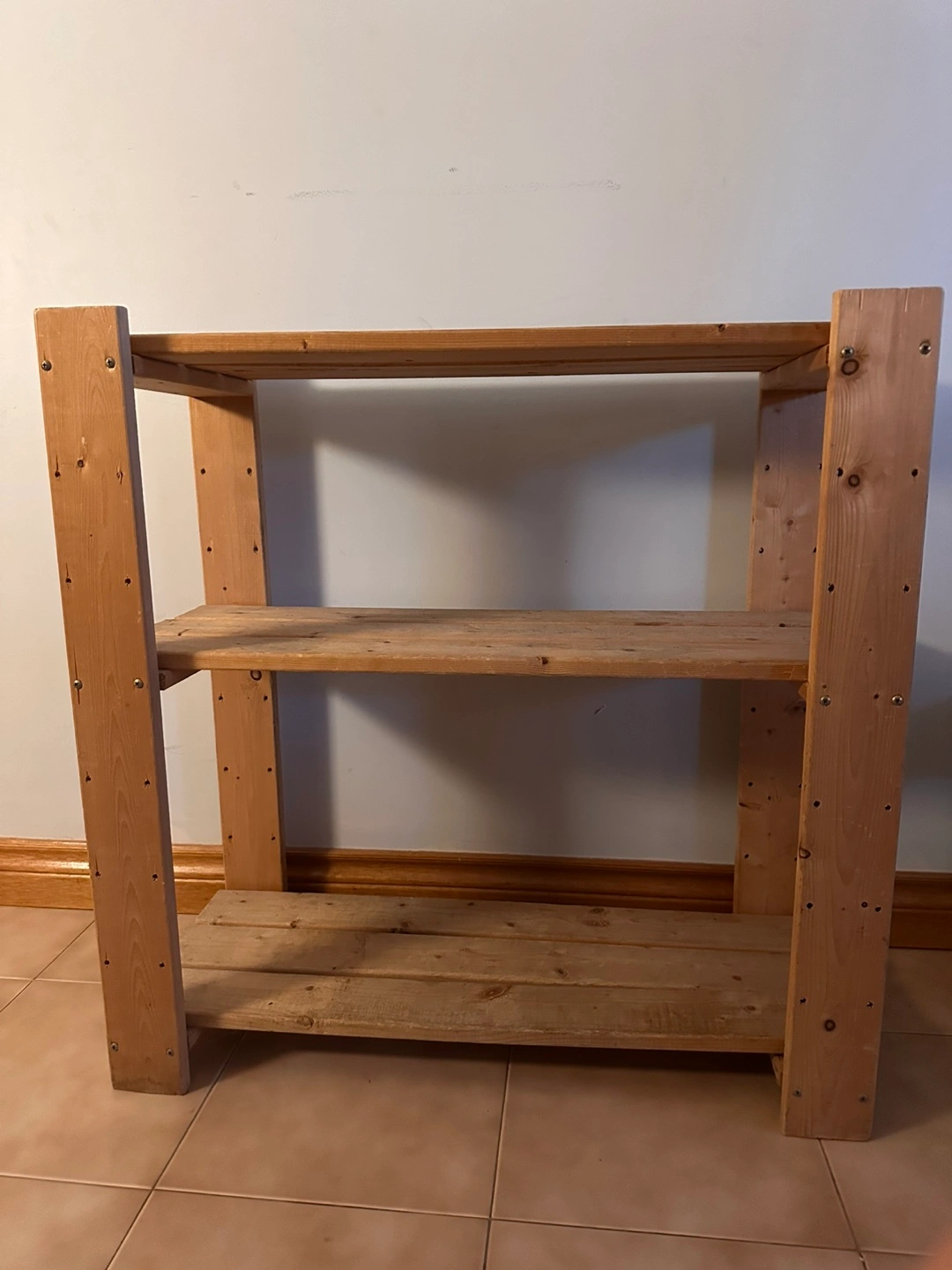 Three-shelf wooden storage unit. Simple design, perfect for organizing various items. Made of light-coloured wood. Assembled.