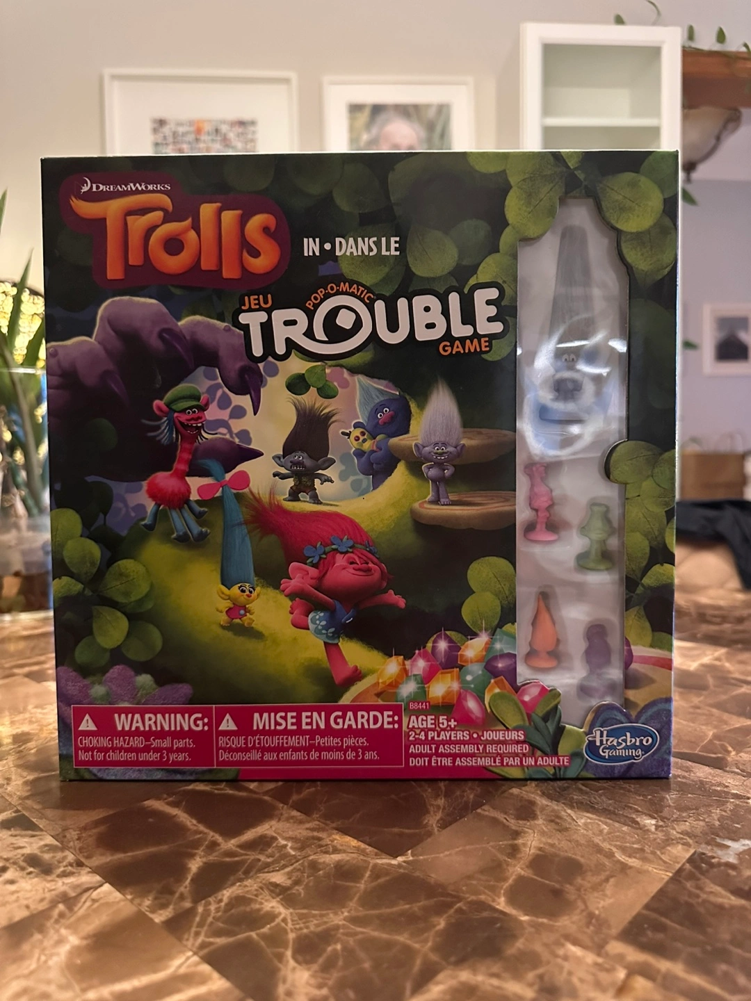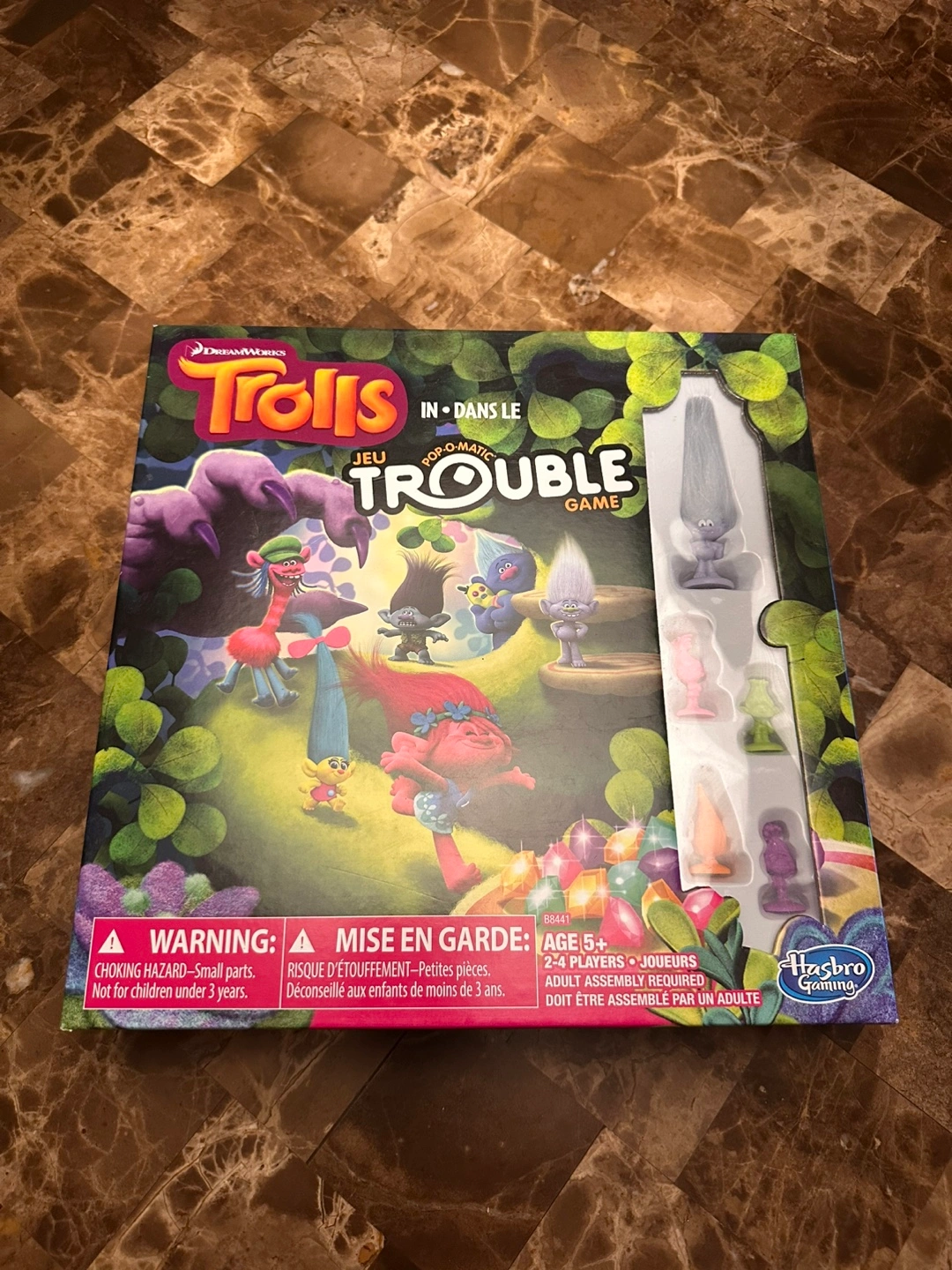 Only played twice. Ages 5+. 2-4 players. Includes game board, pop-o-matic, dice, and Trolls character pawns — everything’s included, nothing missing.