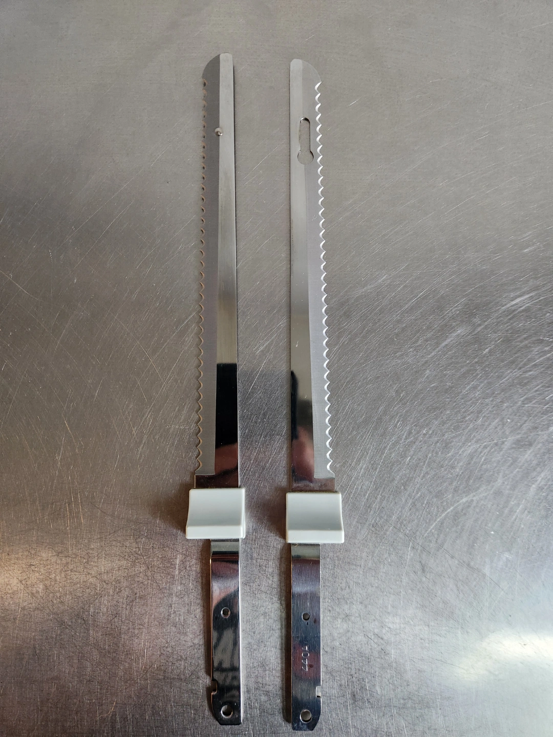 Vintage electric slicing knife. Includes two stainless steel blades. Model EK965. White plastic housing. Wall mount included. Power cord included.