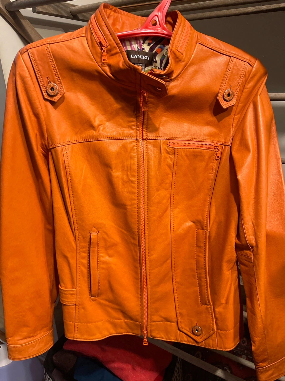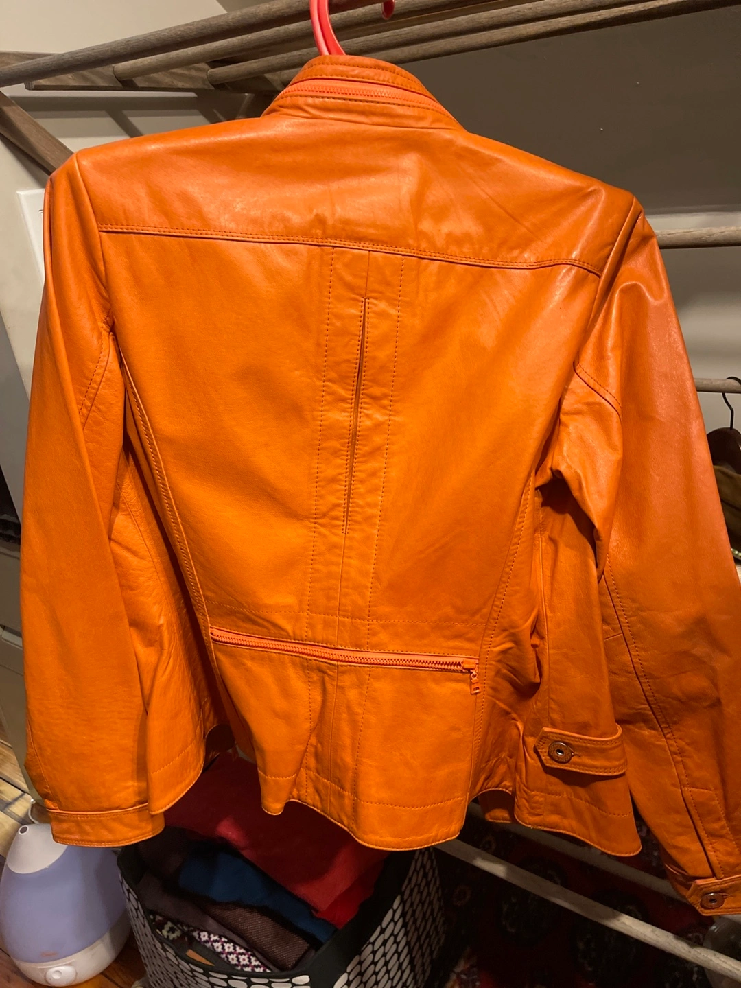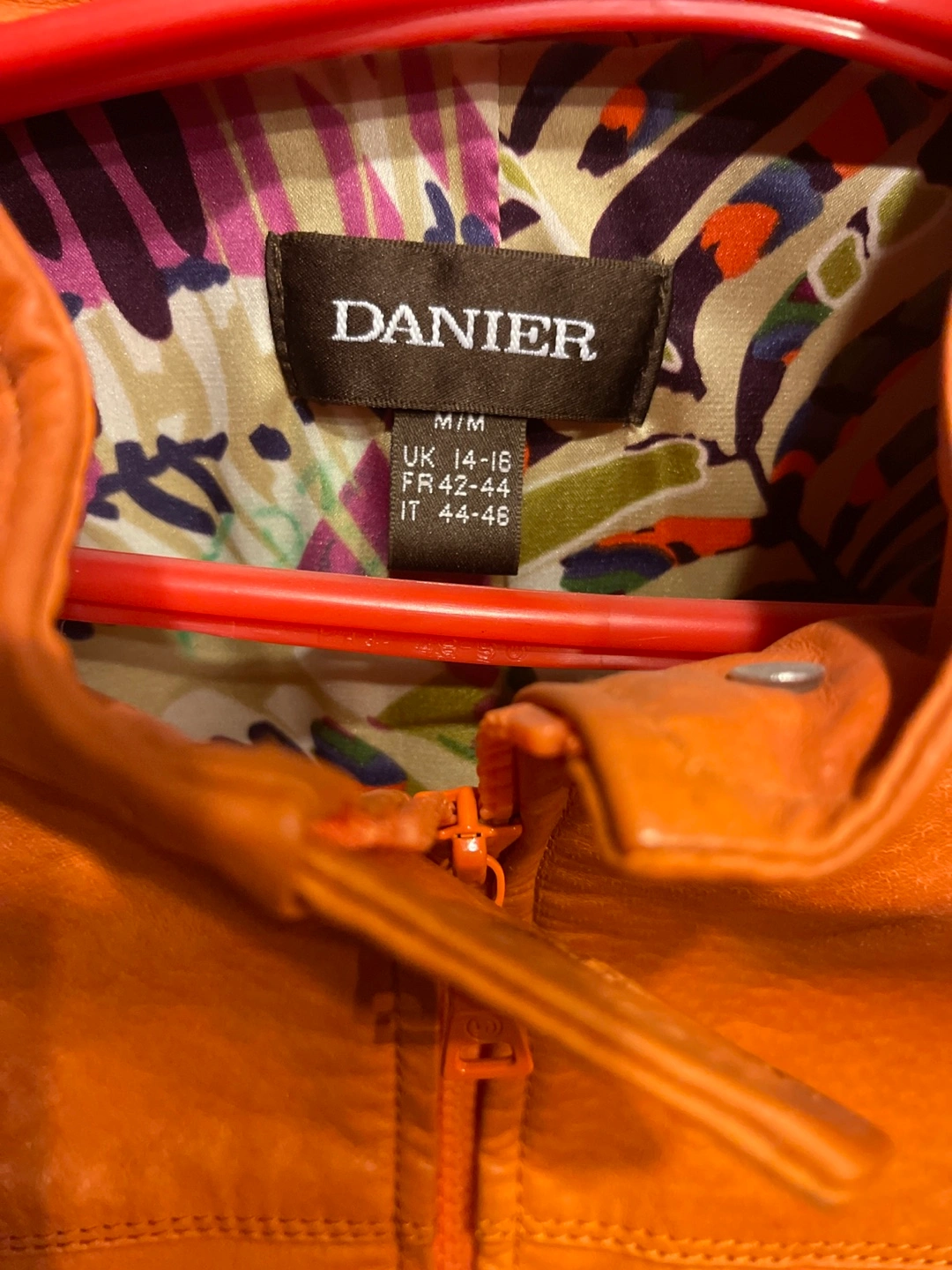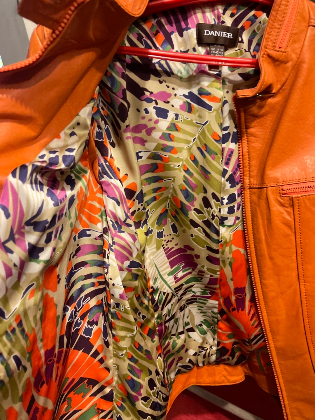 Gorgeous burnt orange leather jacket. Zip front closure. Multiple pockets. Fully lined with vibrant patterned fabric. Size M/M (UK 14-16, FR 42-44, IT 44-48). Excellent condition.
