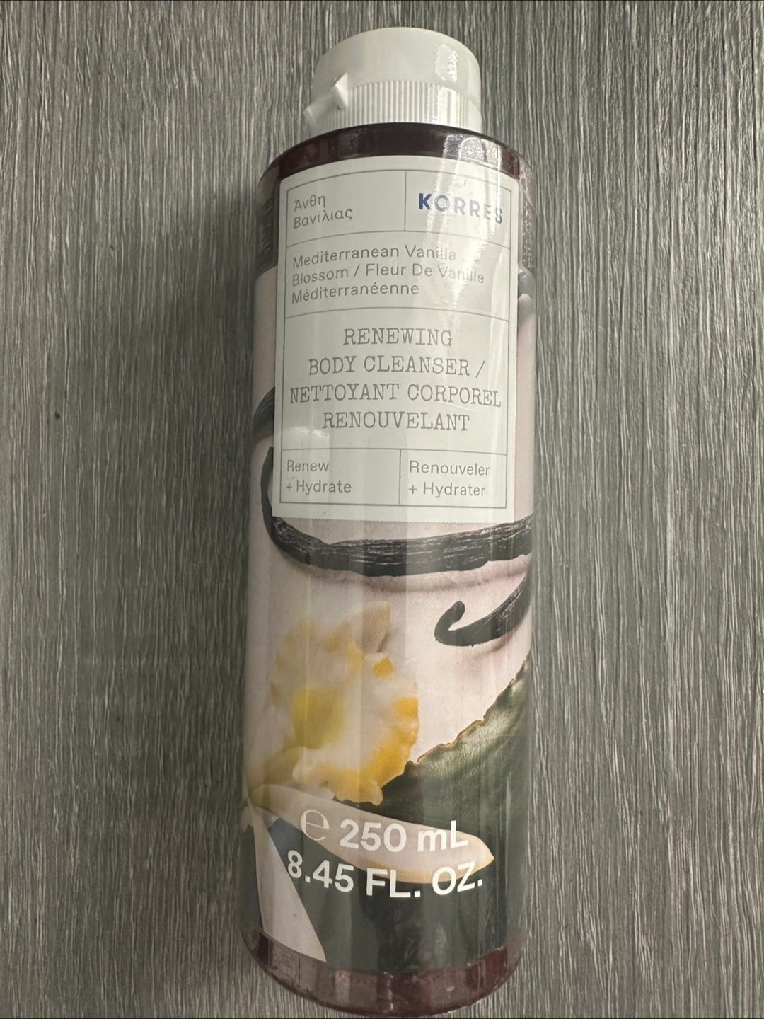 *New* 250ml bottle of Korres Renewing Body Cleanser in Mediterranean Vanilla scent. New, unopened.
