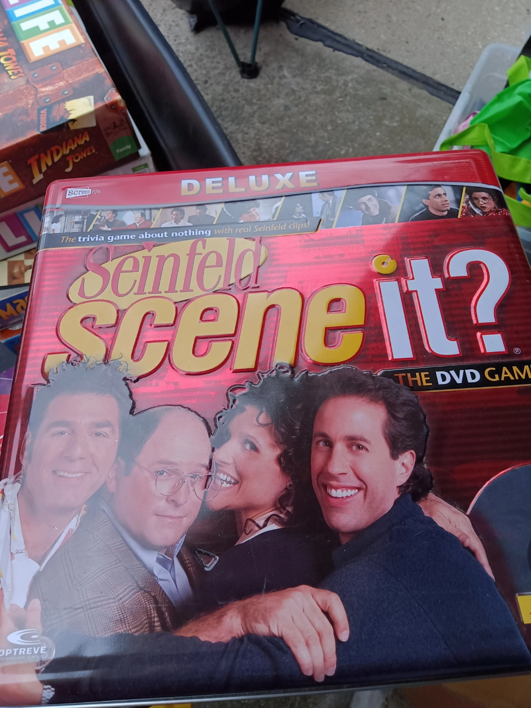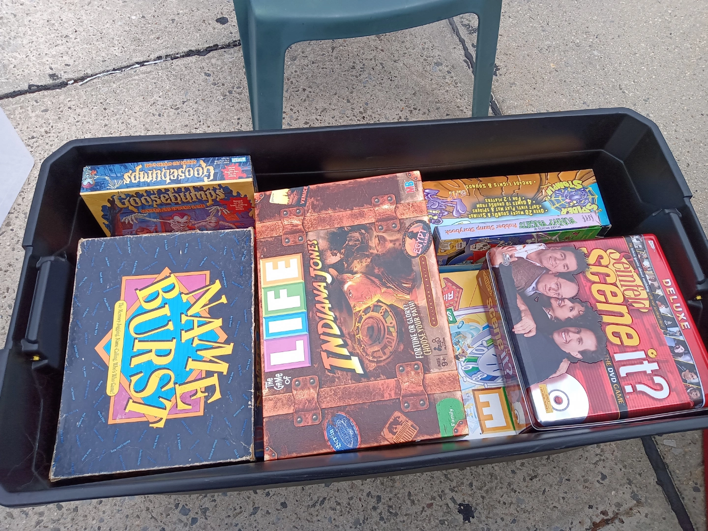 Collection of used board games. Includes Goosebumps, Indiana Jones, Life, Scene It? Seinfeld, Spider Stompin', Name That Tune, and more. Scattegories, Nameburst, also a Reader's Digest Scary Sight's Funny Frights rubber stamp storybook (ink pads are probably dry, but easy to get for replacement) & more.