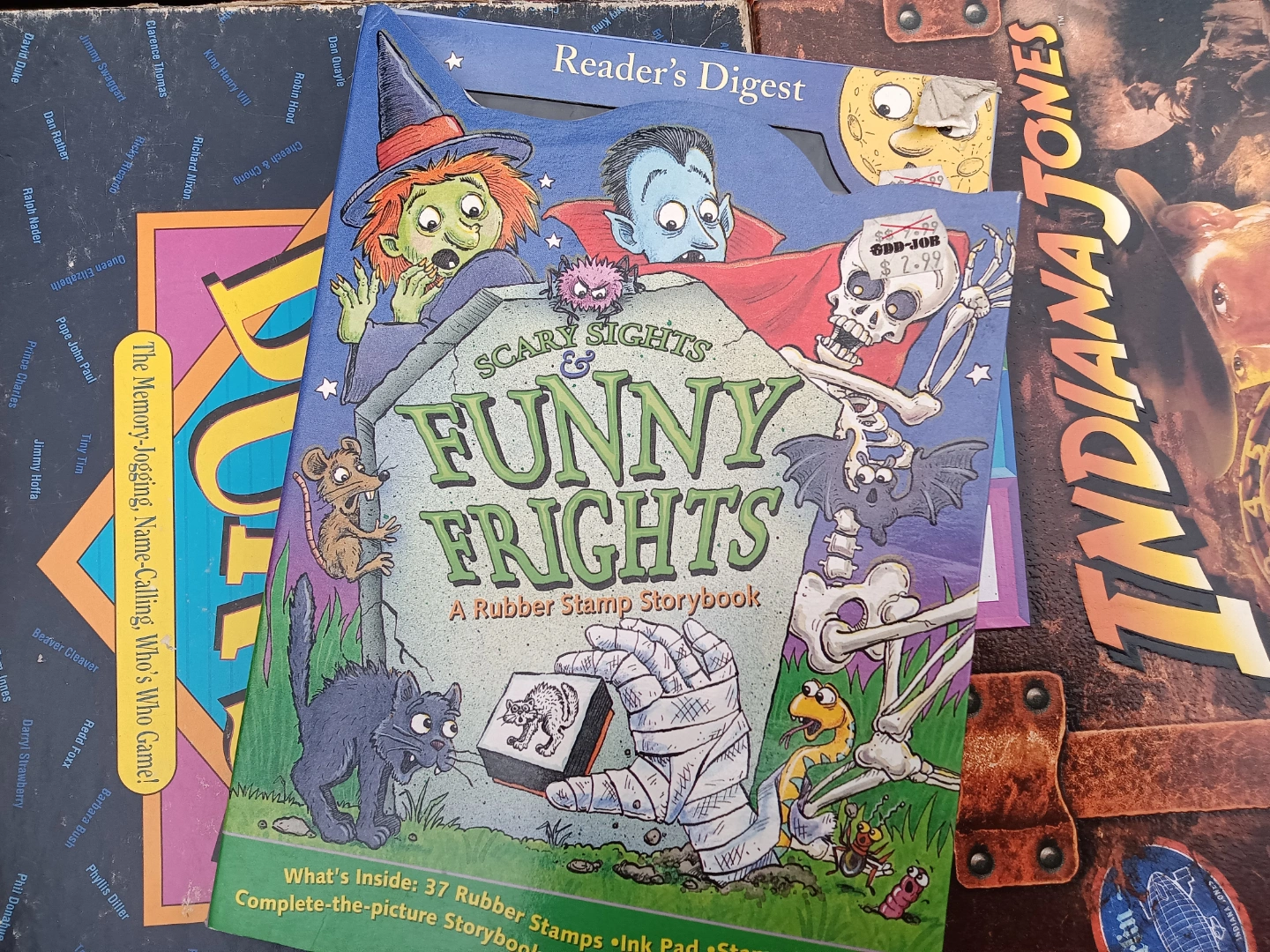 Collection of used board games. Includes Goosebumps, Indiana Jones, Life, Scene It? Seinfeld, Spider Stompin', Name That Tune, and more. Scattegories, Nameburst, also a Reader's Digest Scary Sight's Funny Frights rubber stamp storybook (ink pads are probably dry, but easy to get for replacement) & more.