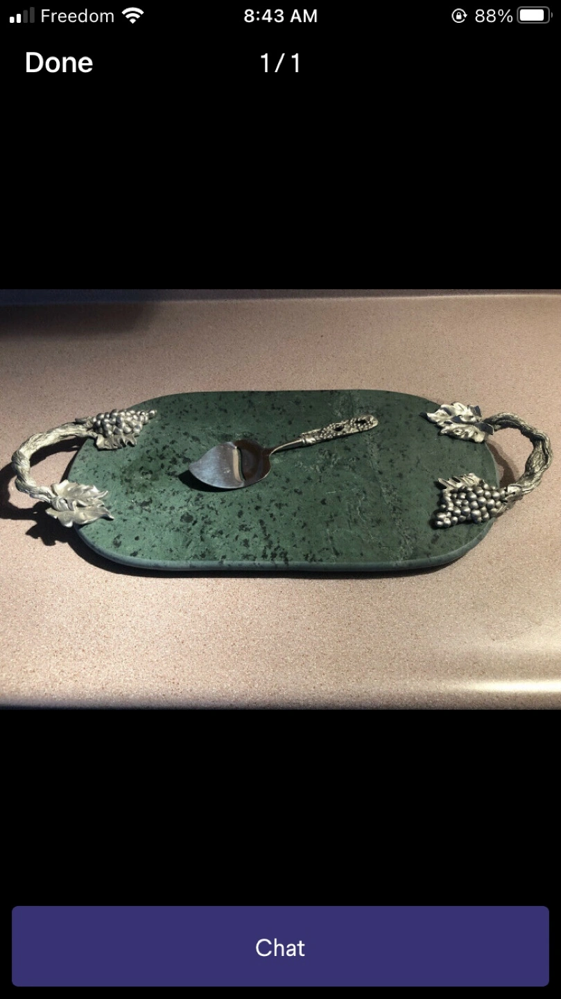 Large oval-shaped marble serving tray. Features pewter grapevine handles on either side. Perfect for cheese, appetizers, or other serving needs. Unique and elegant.