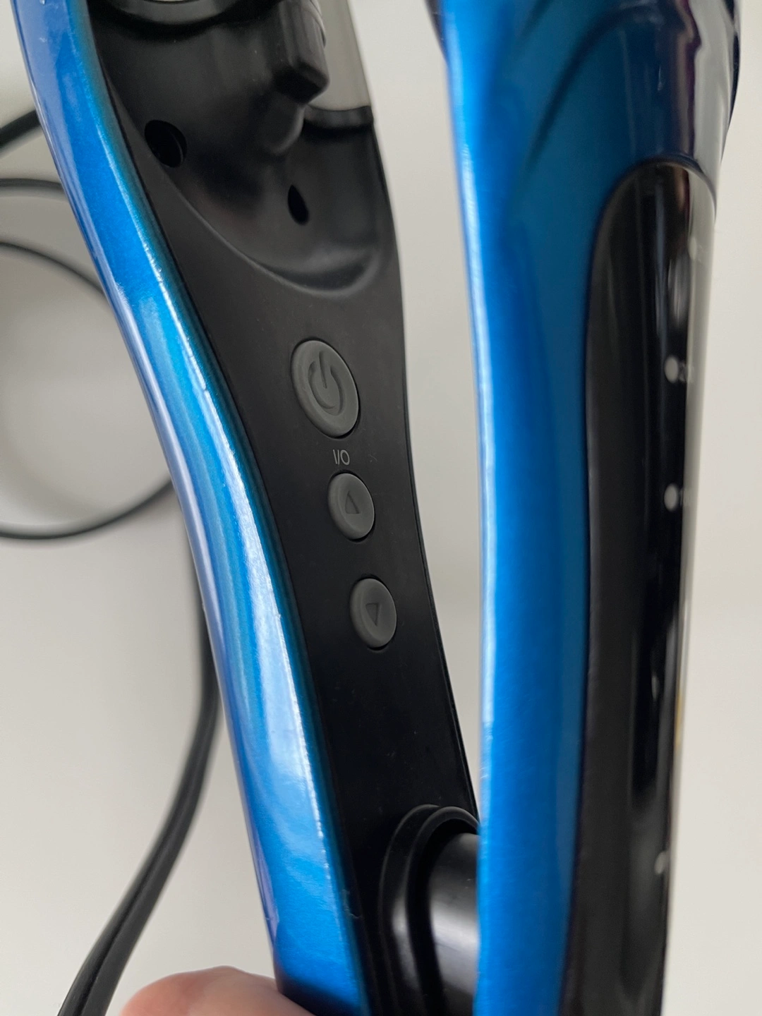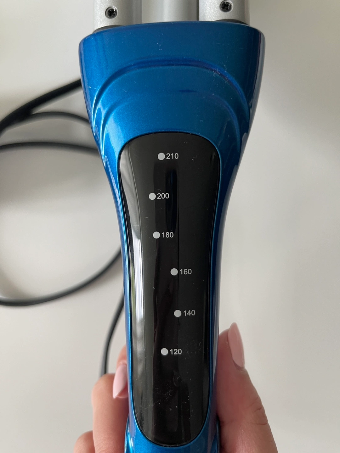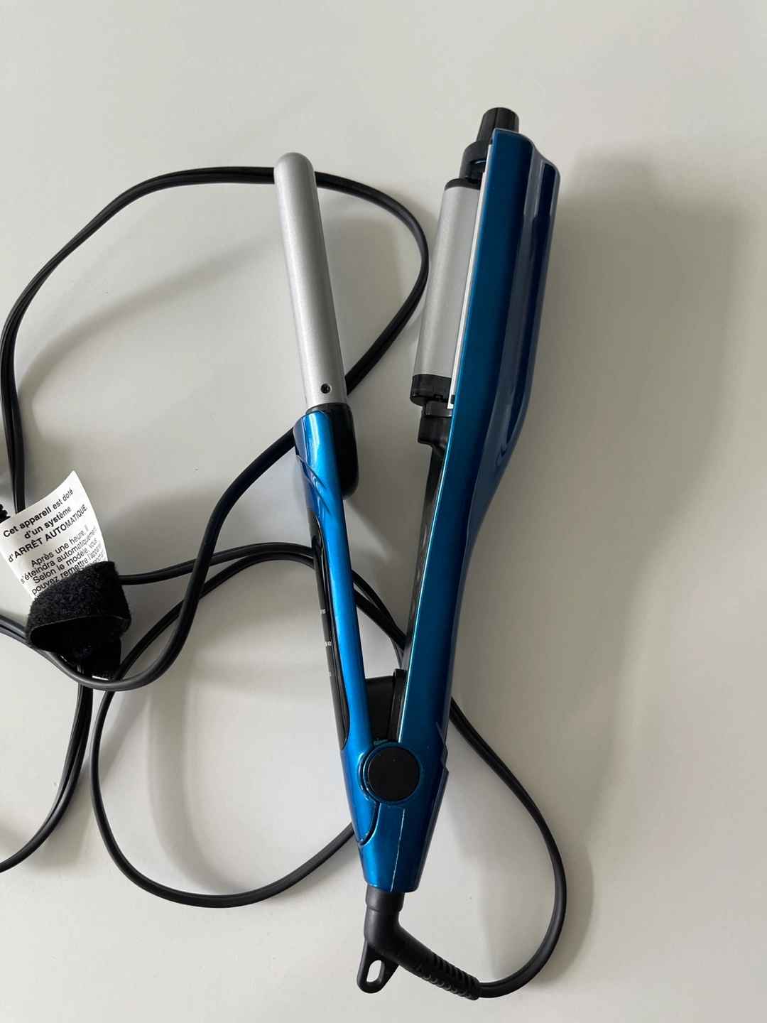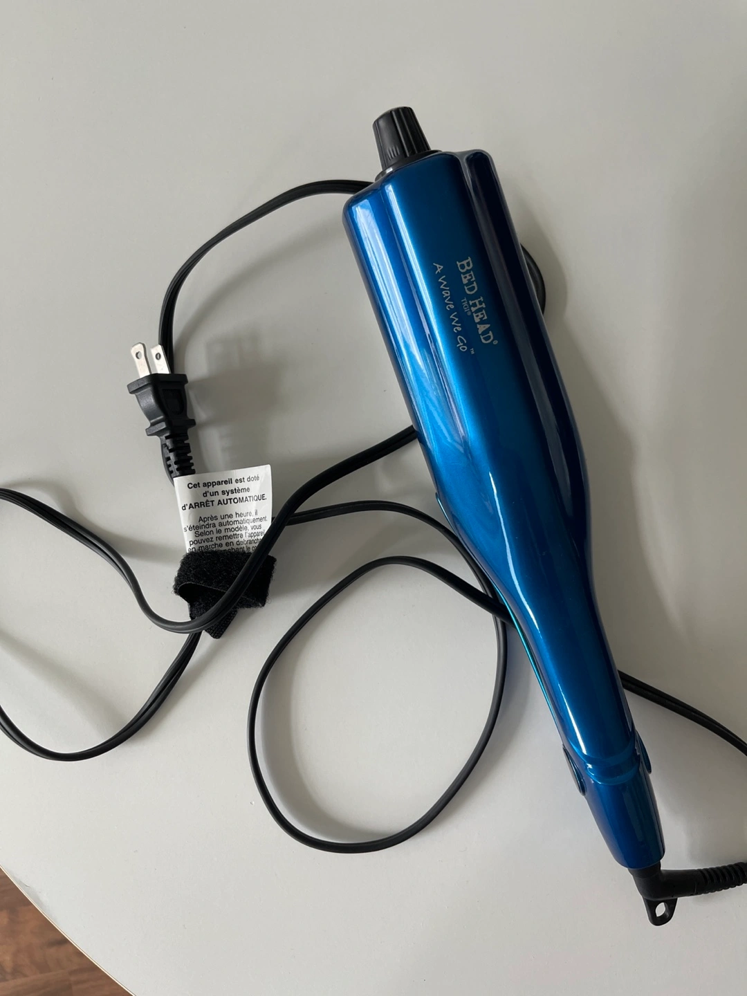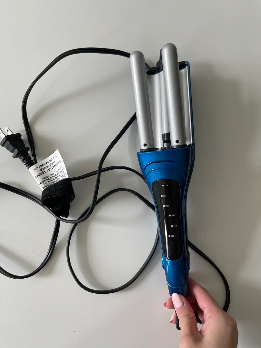 Blue triple barrel waver. Multiple heat settings. Good condition. Includes power cord.