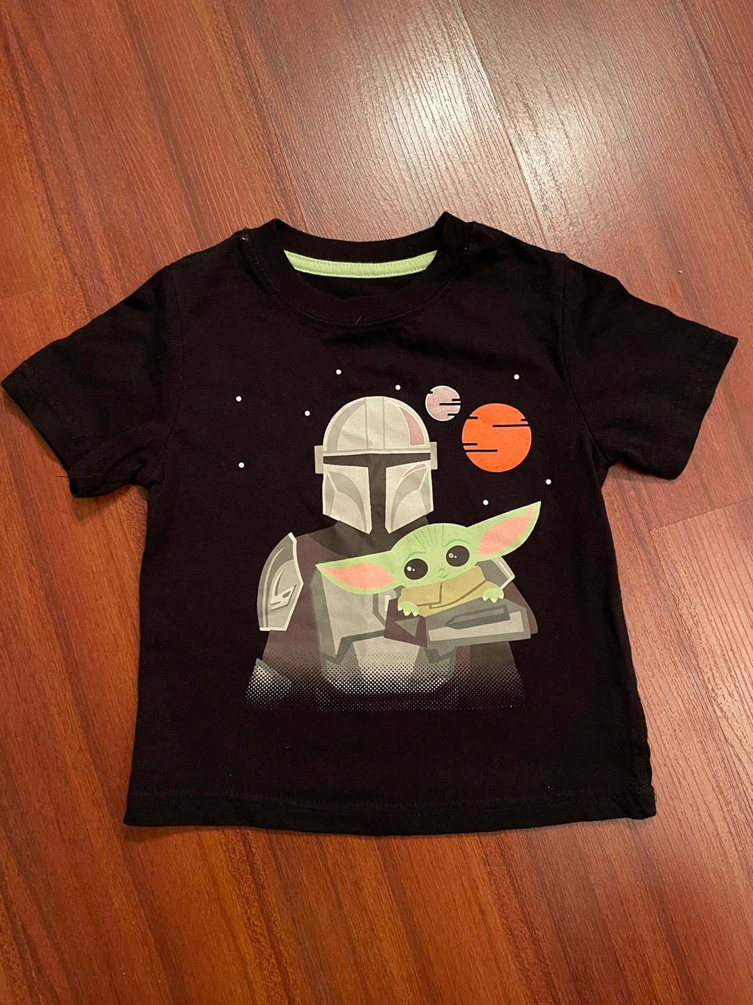Cute black toddler t-shirt featuring Mandalorian and Grogu. Perfect for Star Wars fans!
