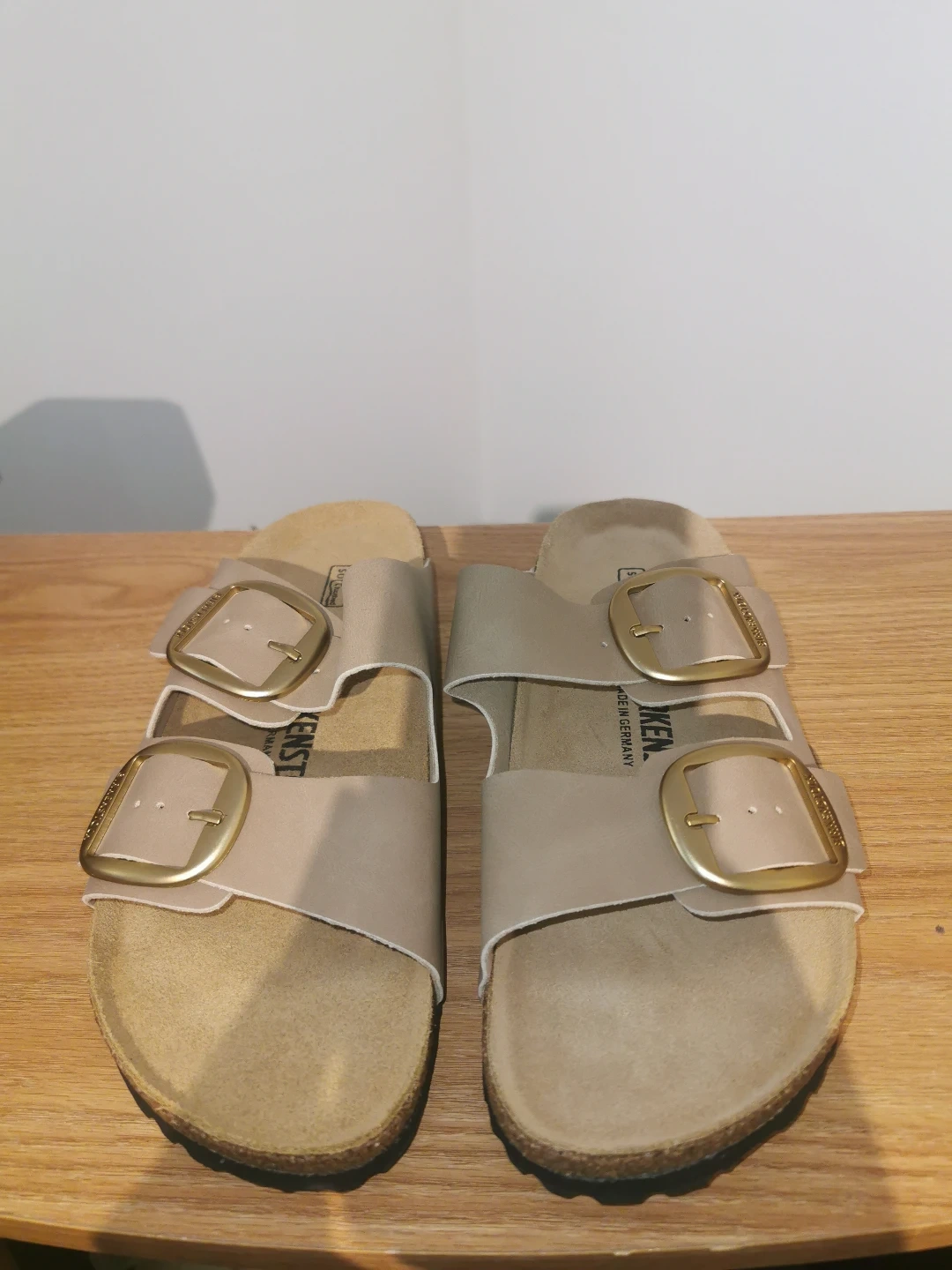 Beige leather sandals. Double buckle detail. Cork footbed. Made in Germany. Size 38.
