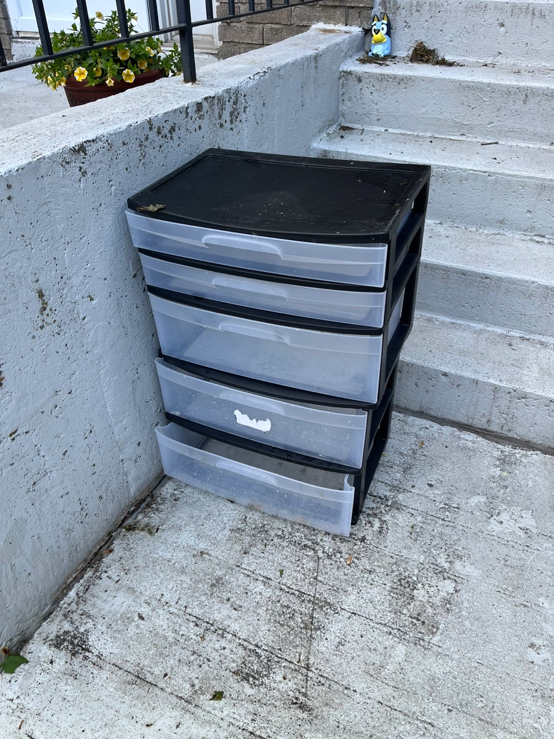 Black plastic frame, clear drawers. Good for organizing small items. Some minor wear.