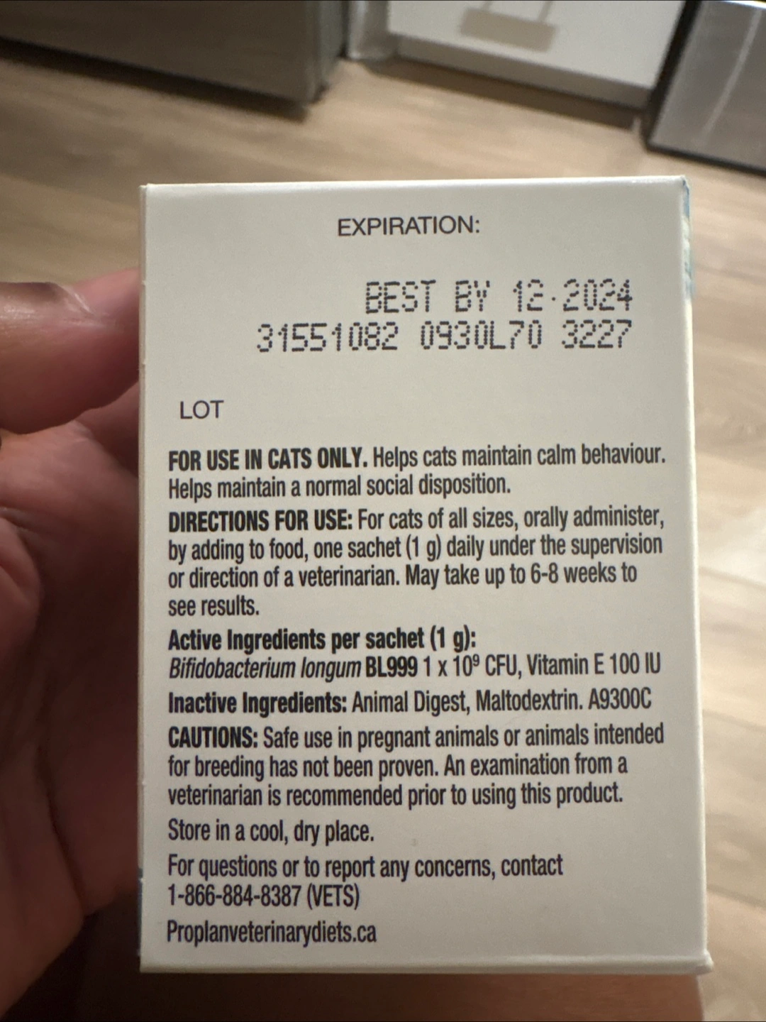30g of powdered probiotic supplement. Helps cats maintain calm behaviour and a normal social disposition. One box with 30 individual sachets.