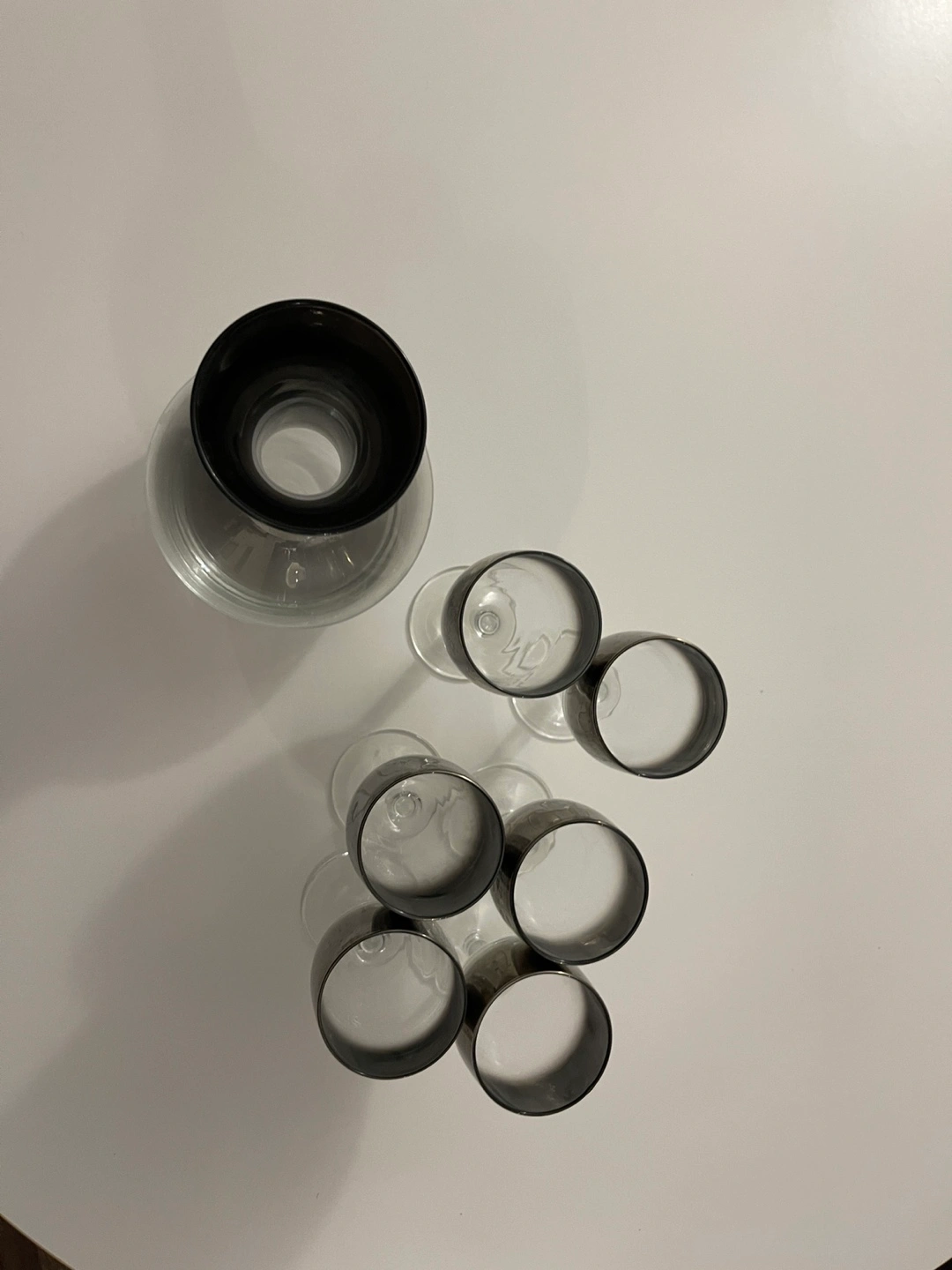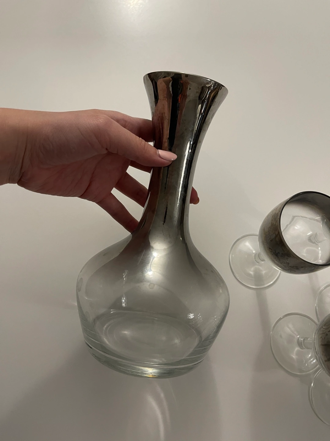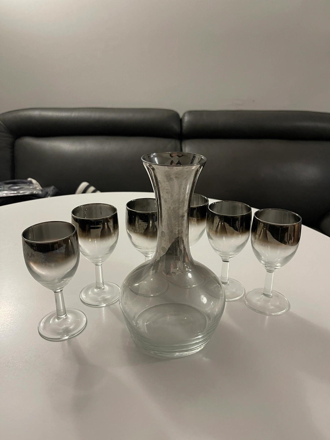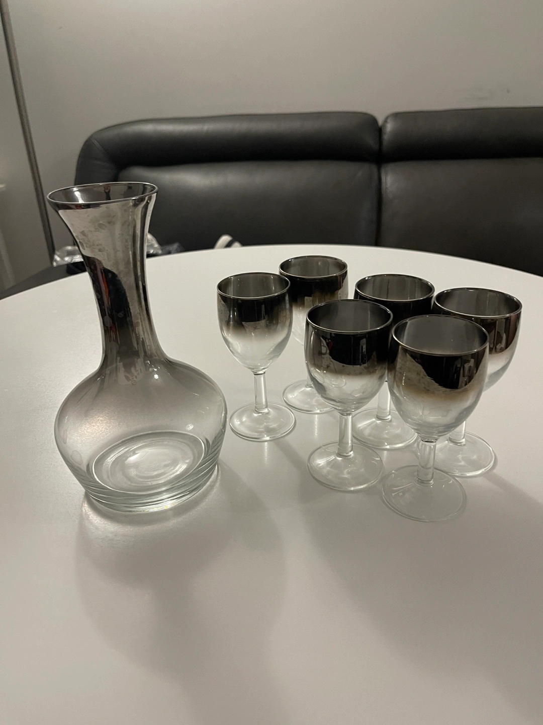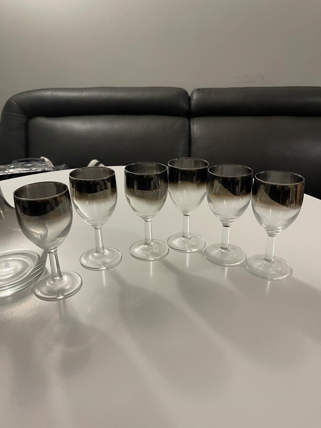 Set includes one decanter and six stemmed glasses. Elegant ombre design. Silver-toned accents. Perfect condition and the black part isn’t burnt — it’s just the design.