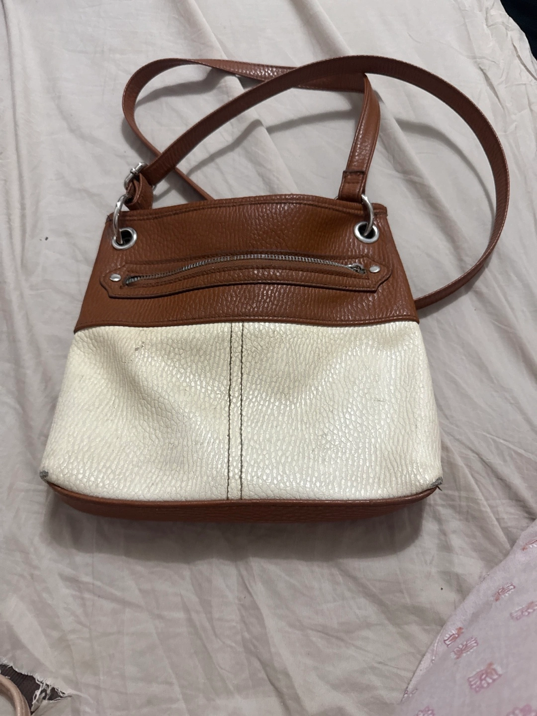 Stylish two-tone crossbody bag. Features a brown top and cream bottom. Adjustable shoulder strap. Zipper closure. Small size, perfect for everyday use.