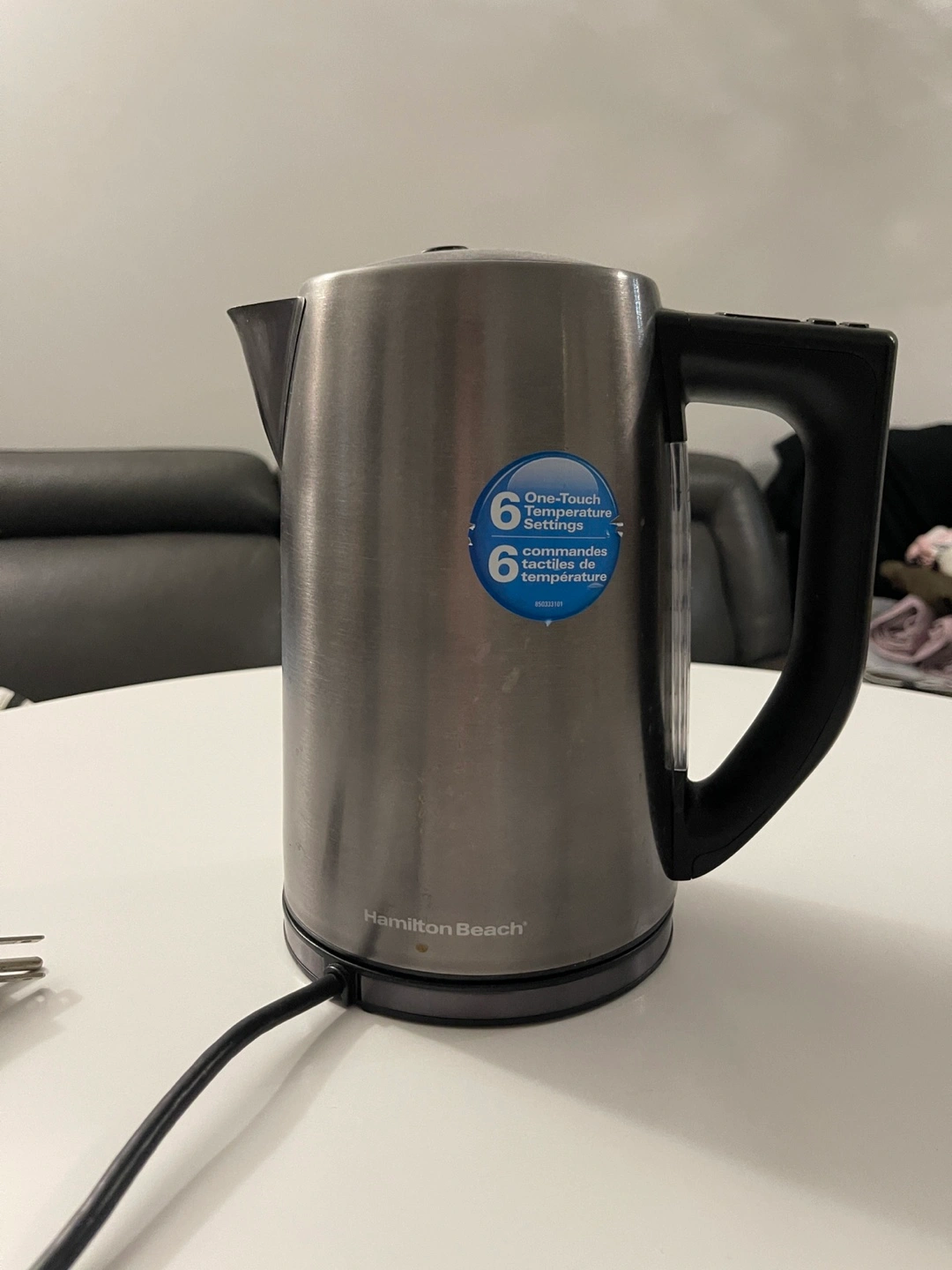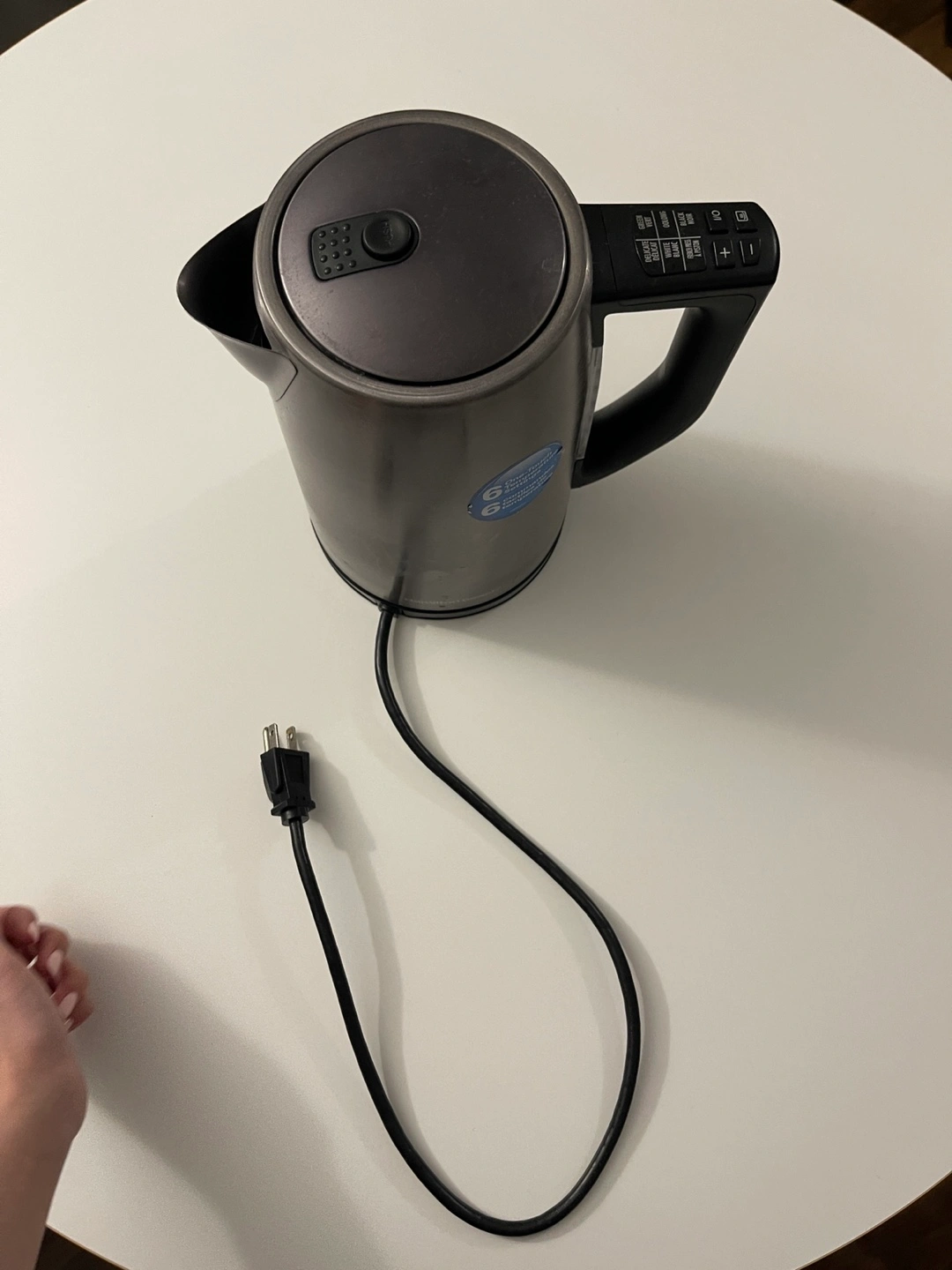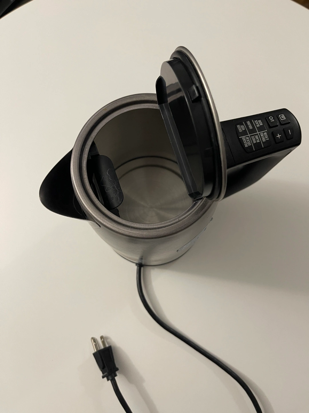 Stainless steel electric kettle. Features six one-touch temperature settings. Cord included. Used but in good condition.