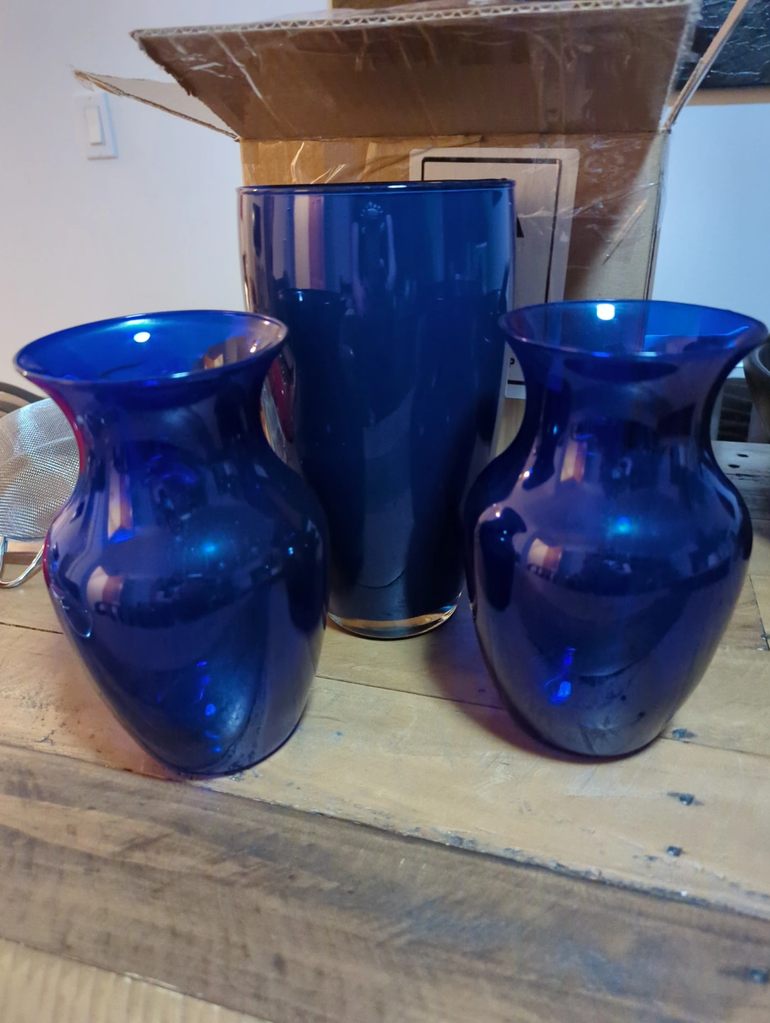 Three beautiful cobalt blue glass vases. Two smaller vases and one taller vase. Perfect for home decor or gifting. Free pickup King & Sackville. π