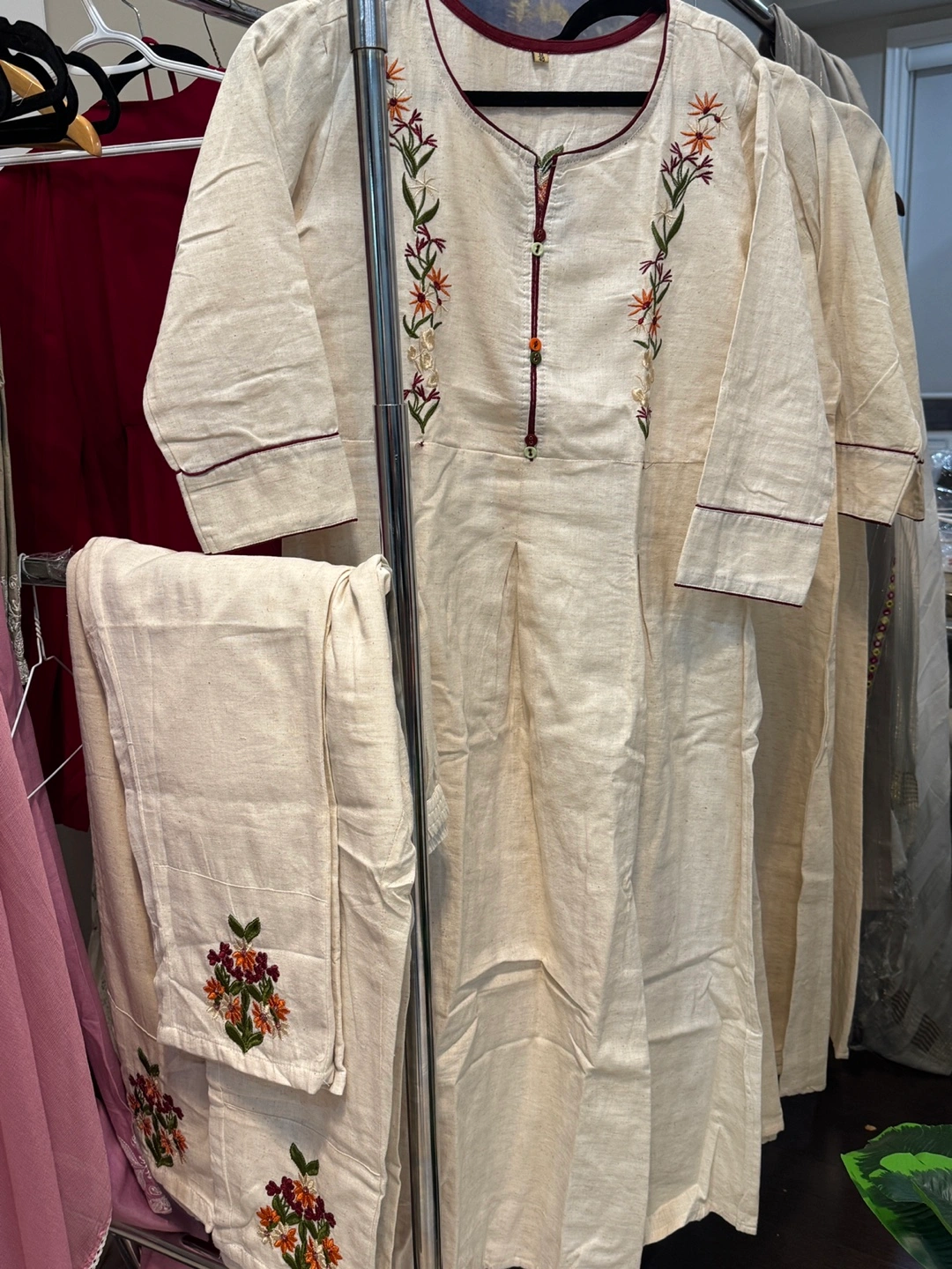 Beautiful off-white kurta and palazzo set. Features embroidered floral details. Three-quarter sleeves. Palazzo pants have elasticated cuffs. Relaxed fit. Pure khadi cotton