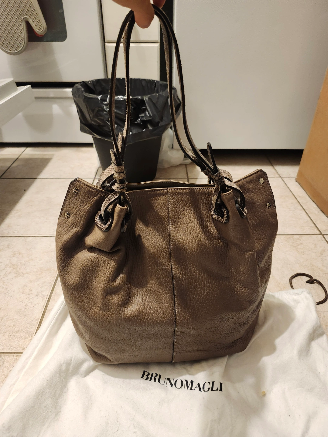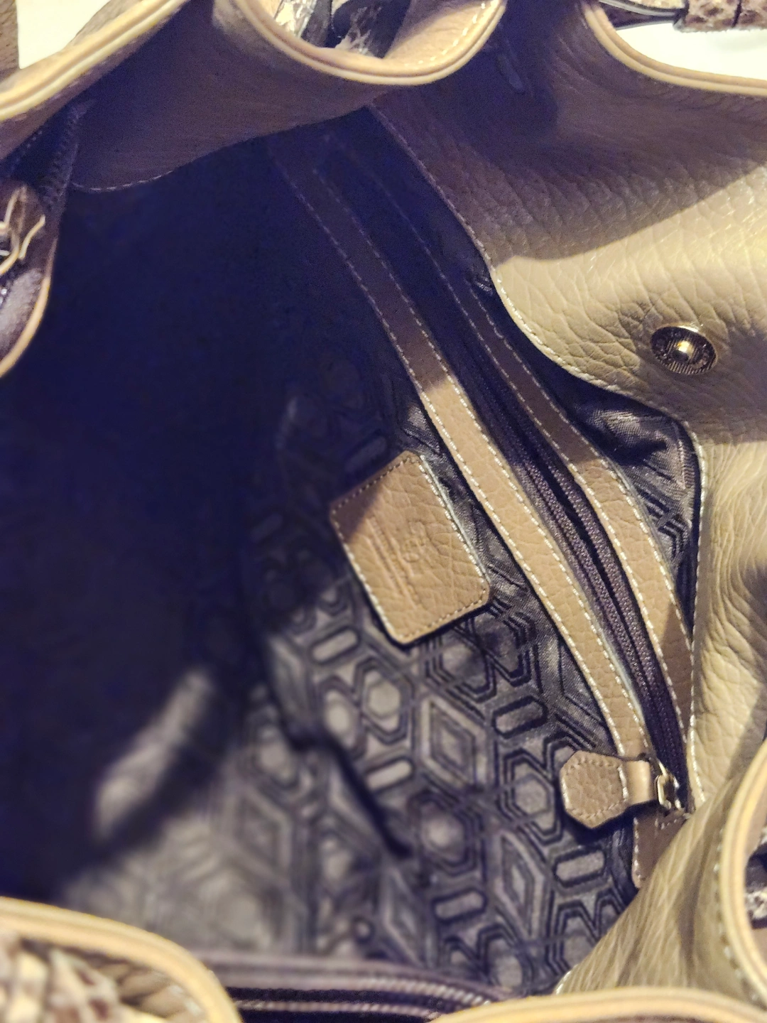 Large taupe leather tote bag. Good for baby mom, big room Double top handles and a zip closure. Interior zip pocket and slip pocket. Excellent condition.