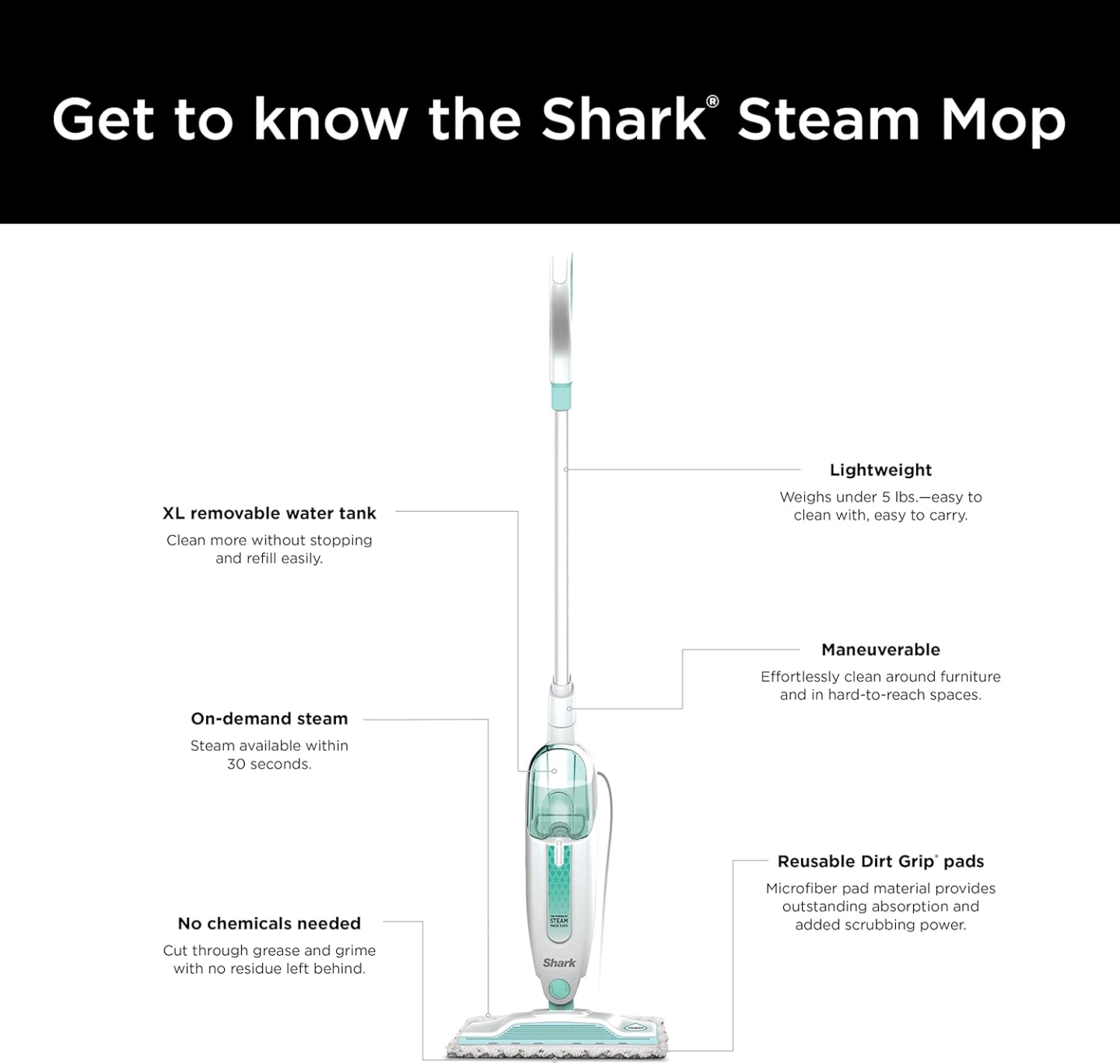 Lightweight and maneuverable steam mop. XL removable water tank. On-demand steam available in 30 seconds. No chemicals needed. Includes two reusable microfiber pads.