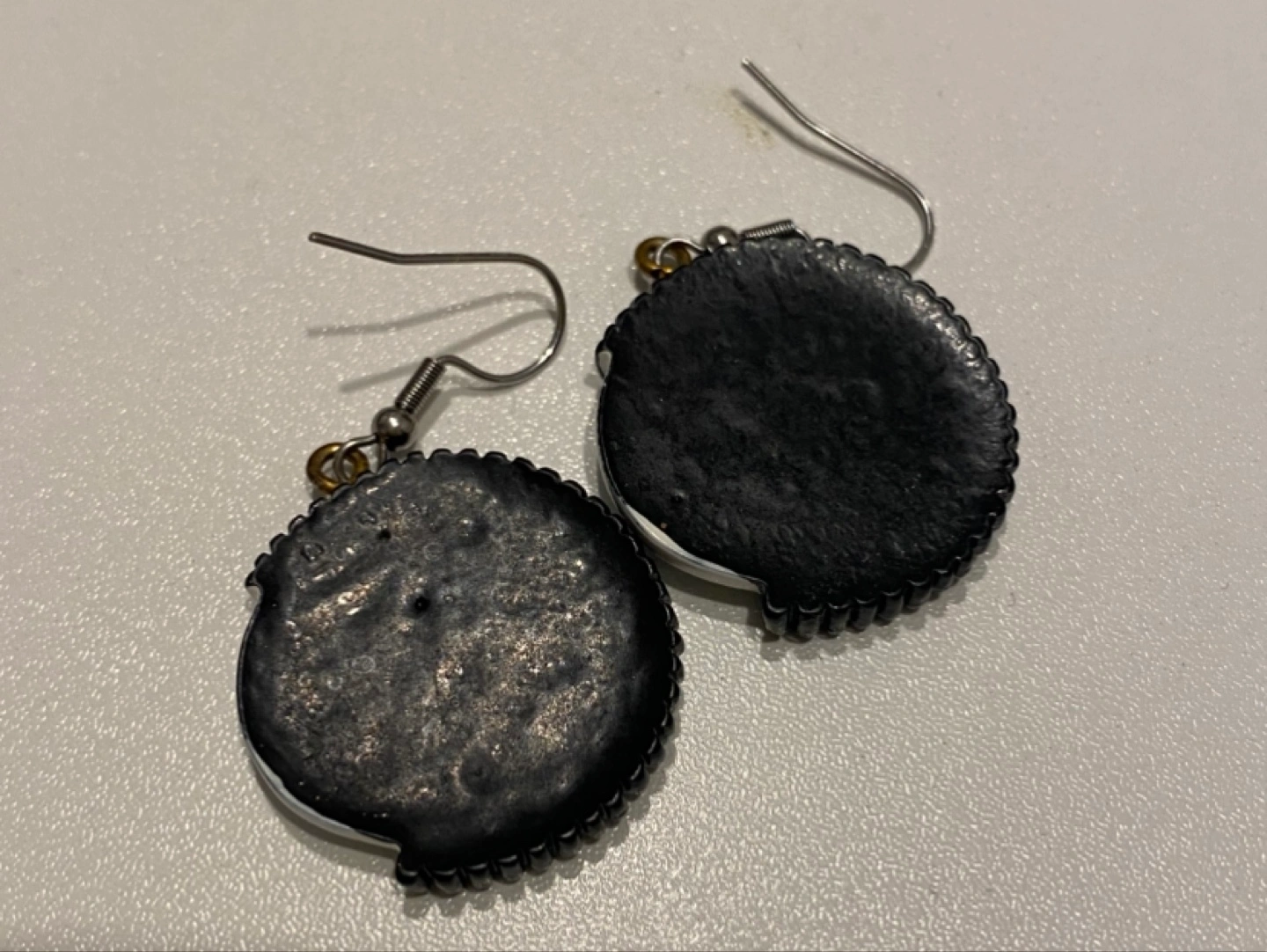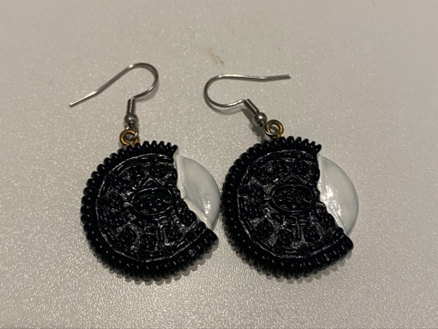 Cute Oreo cookie dangle earrings. Silver nickel-free hooks, although the cookie charms have a small gold piece hook. Unique and fun statement piece. Pre-owned.