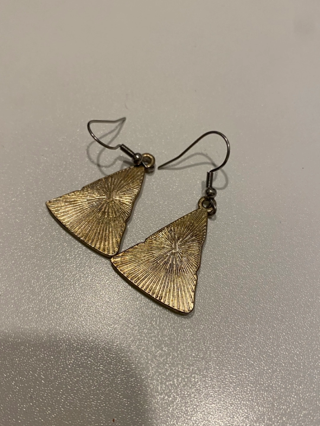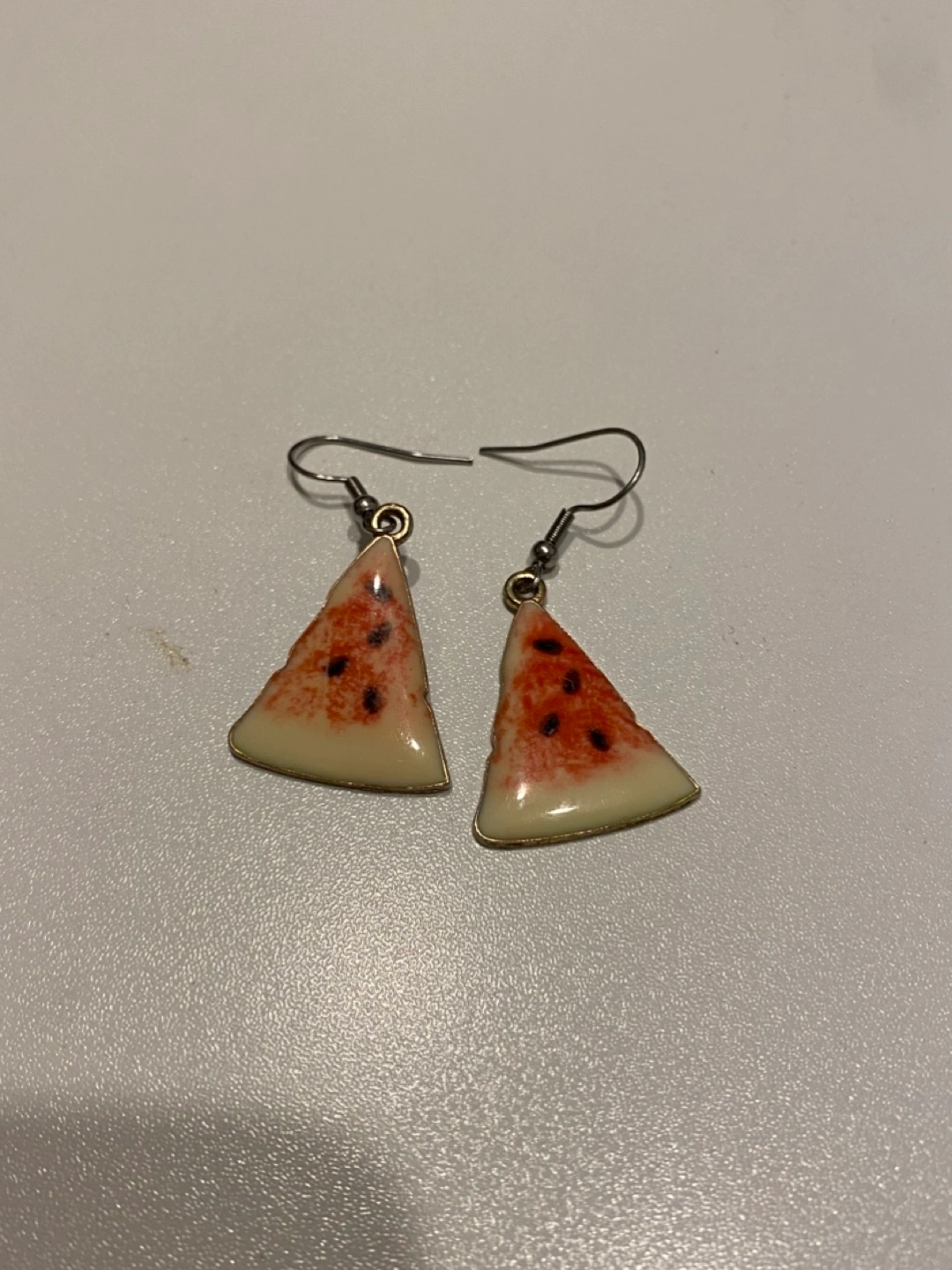 Pair of cute watermelon slice dangle earrings. Gold-toned, with silver nickel-free hooks. Unique and fun statement jewellery, perfect for summer