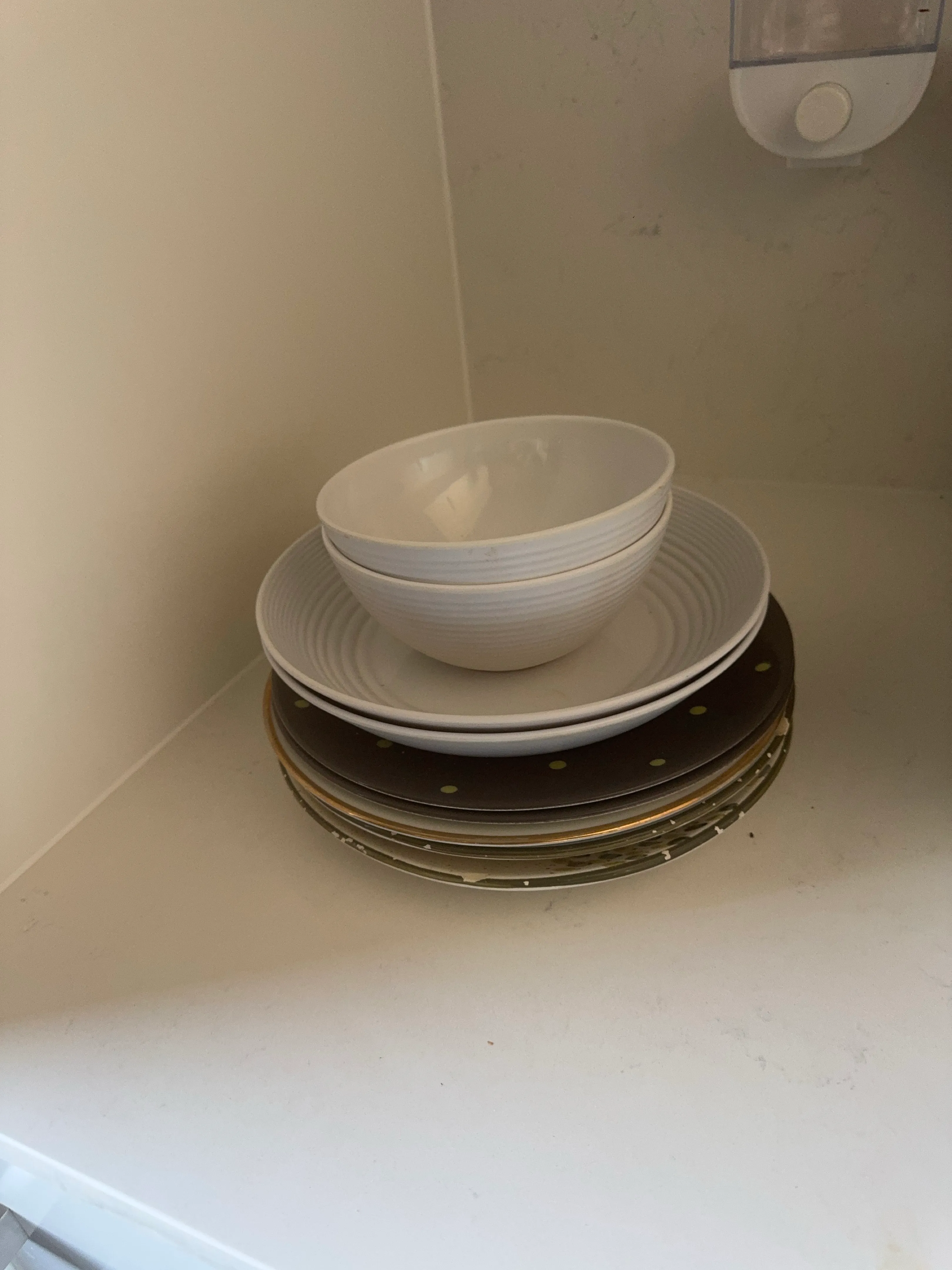 Set of white bowls and patterned plates. Good for everyday use. Stackable for convenient storage.
