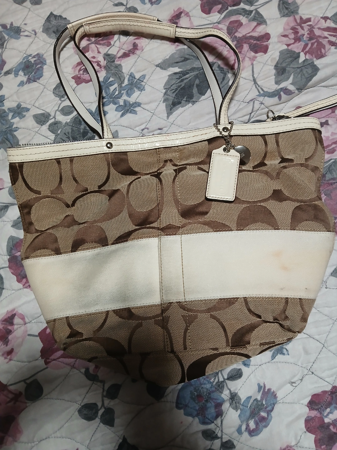533Pre-owned Coach handbag. Brown and off-white colour block design. Features a zipper closure and two shoulder straps. Small Coach tag included. very clean inside. price is firm plz. pick up midland and Danforth or 401 bay street or stc mall or Kennedy stn or runnymede stn