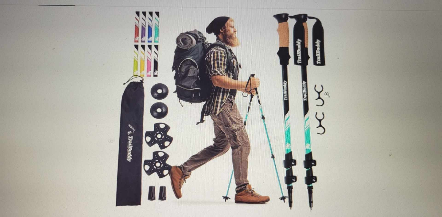 Pair of adjustable TrailBuddy trekking poles. Includes extra tips, and straps. Great for hiking and outdoor adventures.