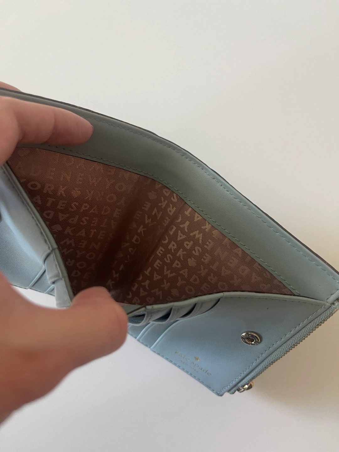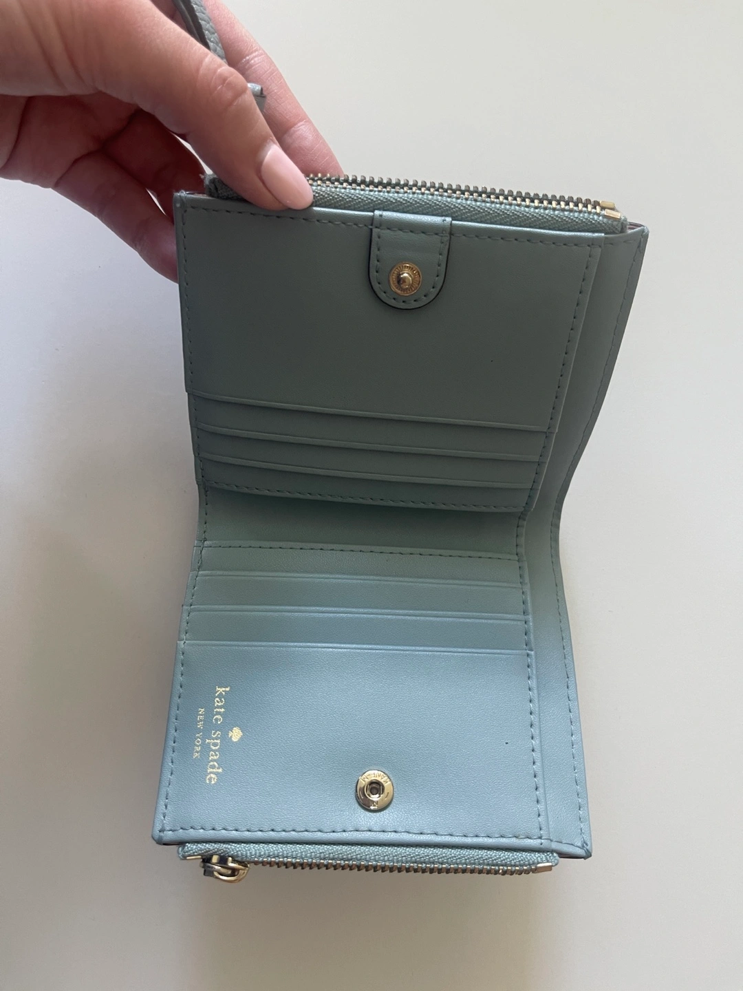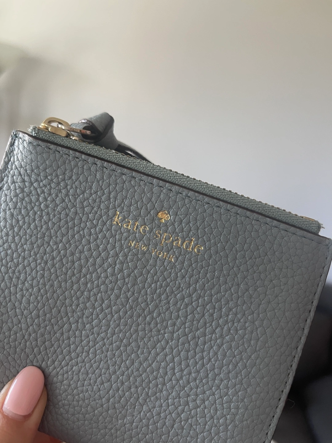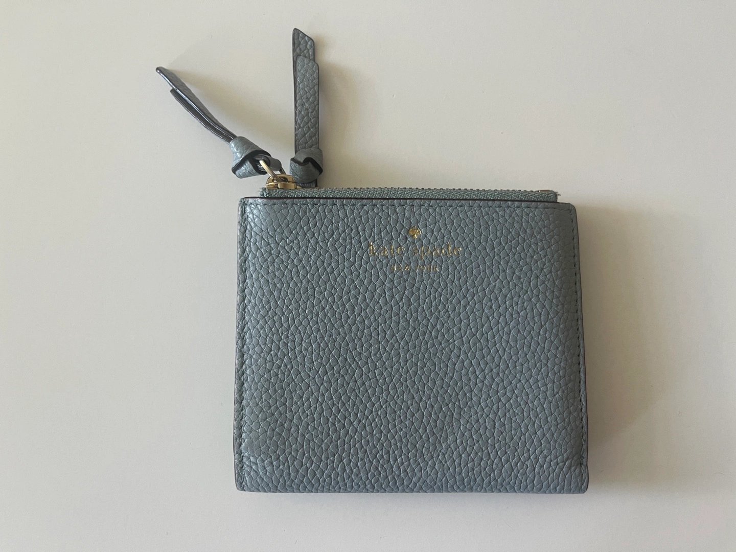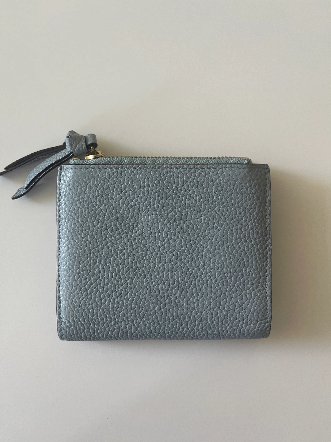 Compact wallet. Grey pebbled leather. Multiple card slots and bill compartments. Small, lightweight design. Perfect for everyday use.