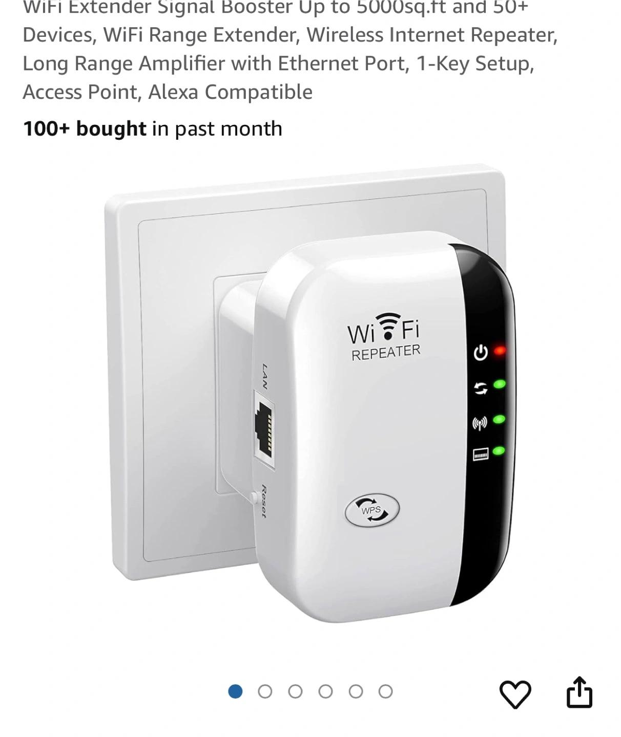 WiFi repeater extends range easily. Access to internet for computers located on the edge or outside your access point. Connects to media receiver to use television over internet. Supports Wireless Repeater and Standard AP Mode. Up to 500 sq ft and 50+ devices. Long range amplifier with Ethernet port. One-key setup. Access point. Alexa compatible.