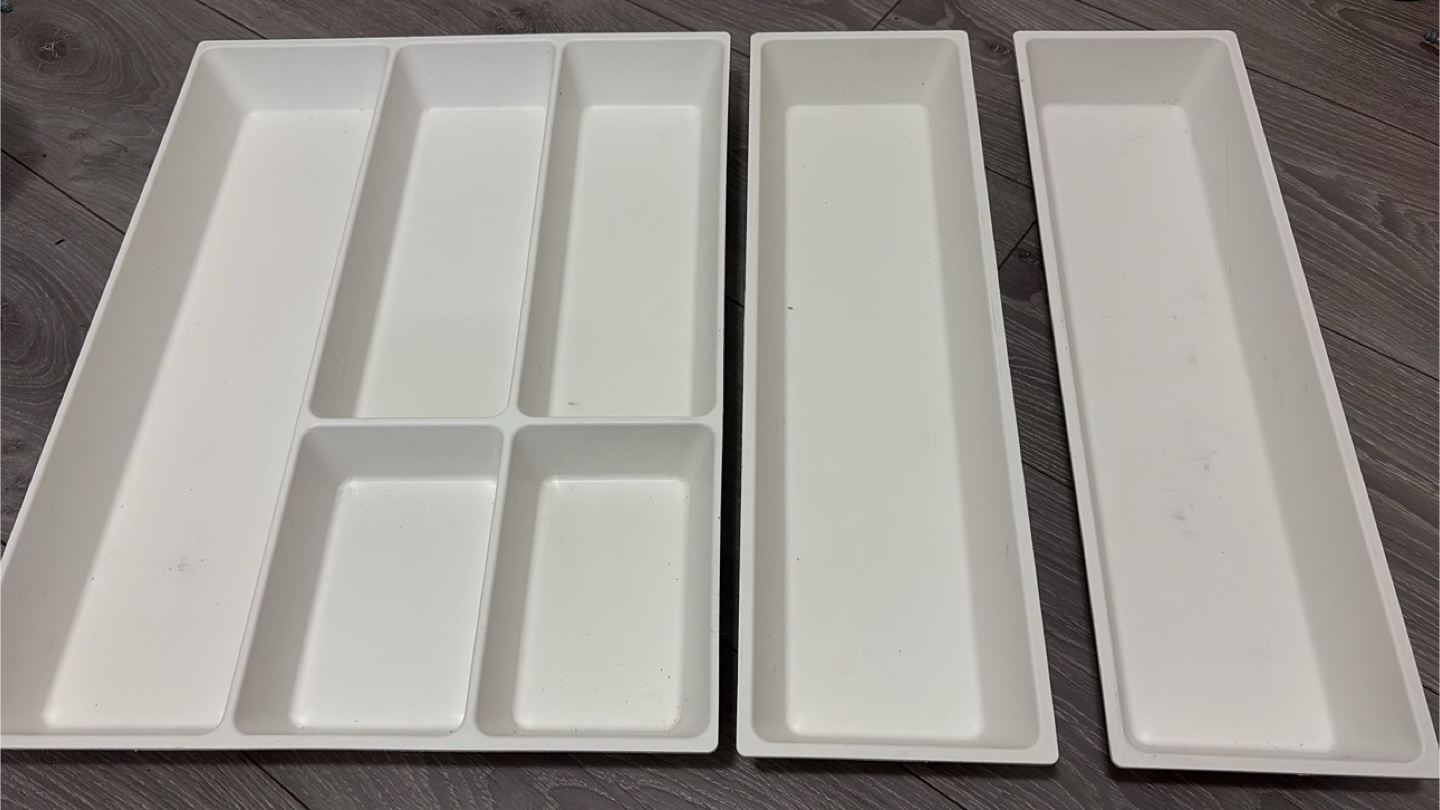 Set of three white plastic drawer organizers. One has multiple compartments, two are single long compartments. Good for cutlery, utensils, or other small items.