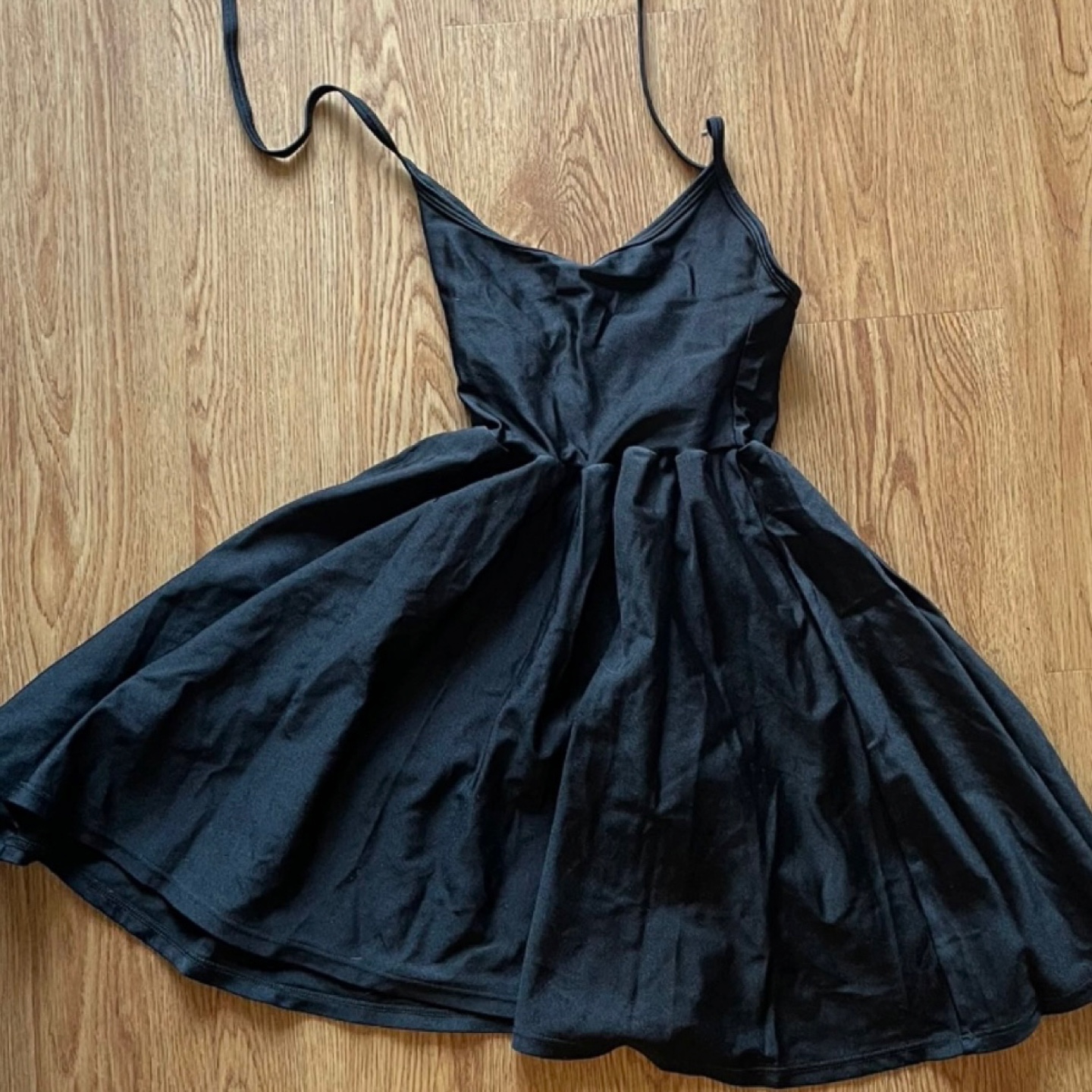 Fit and flare silhouette, halter closure with spaghetti straps. Stretchy fabric so can be worn as a small as well.