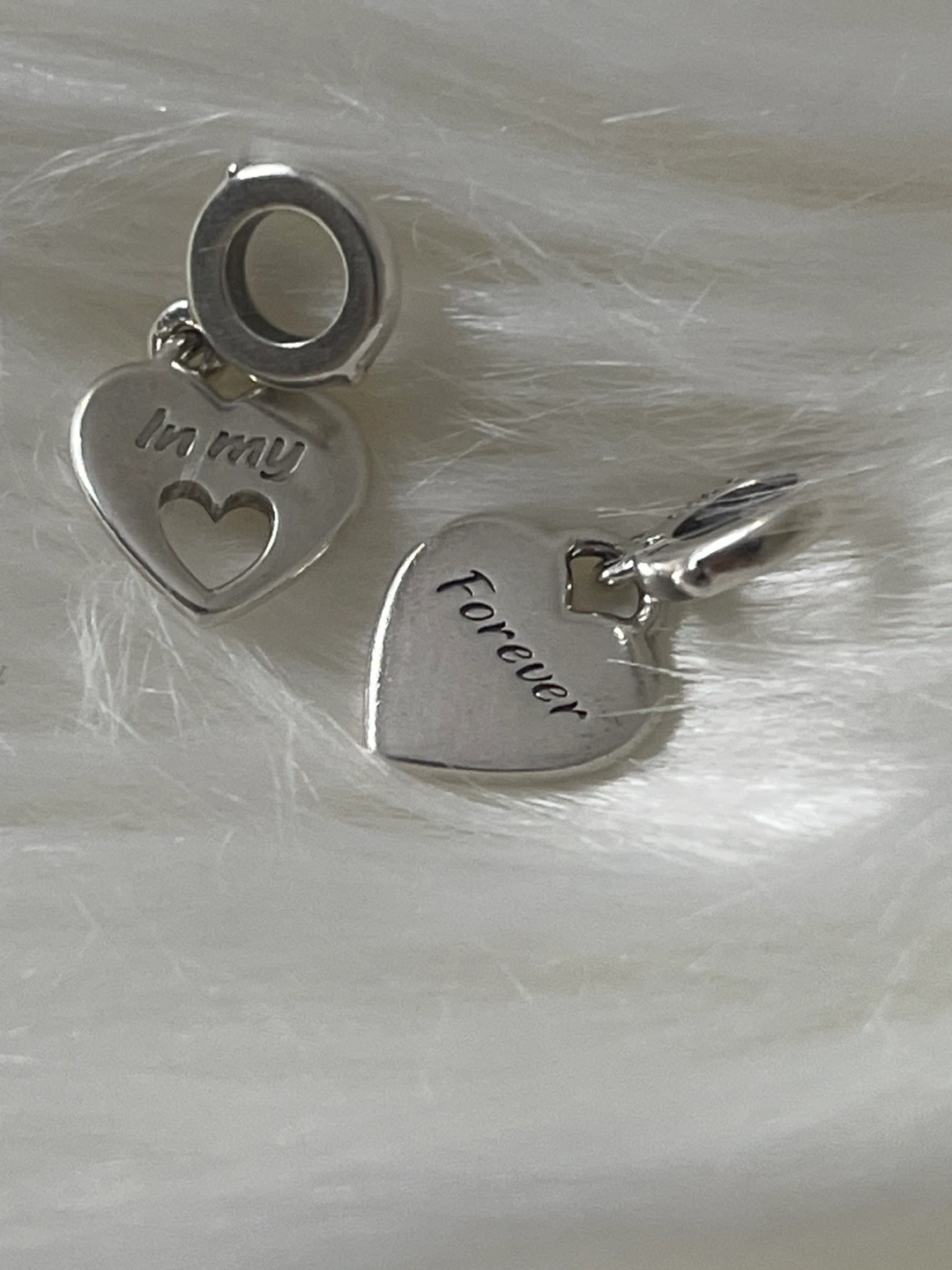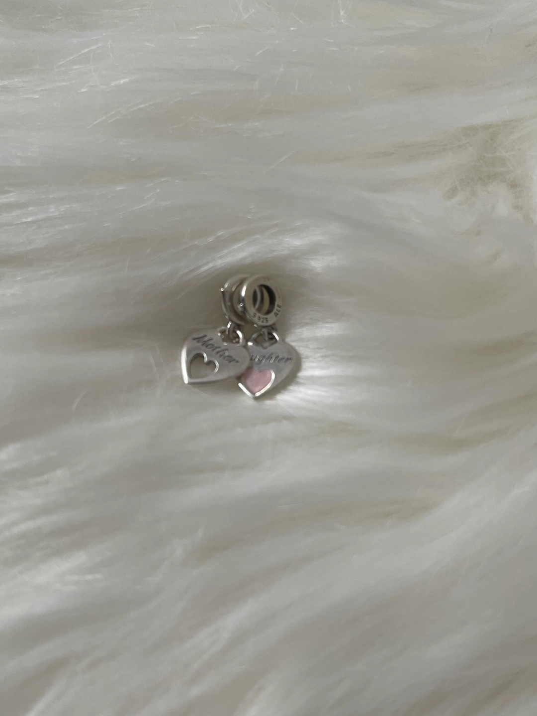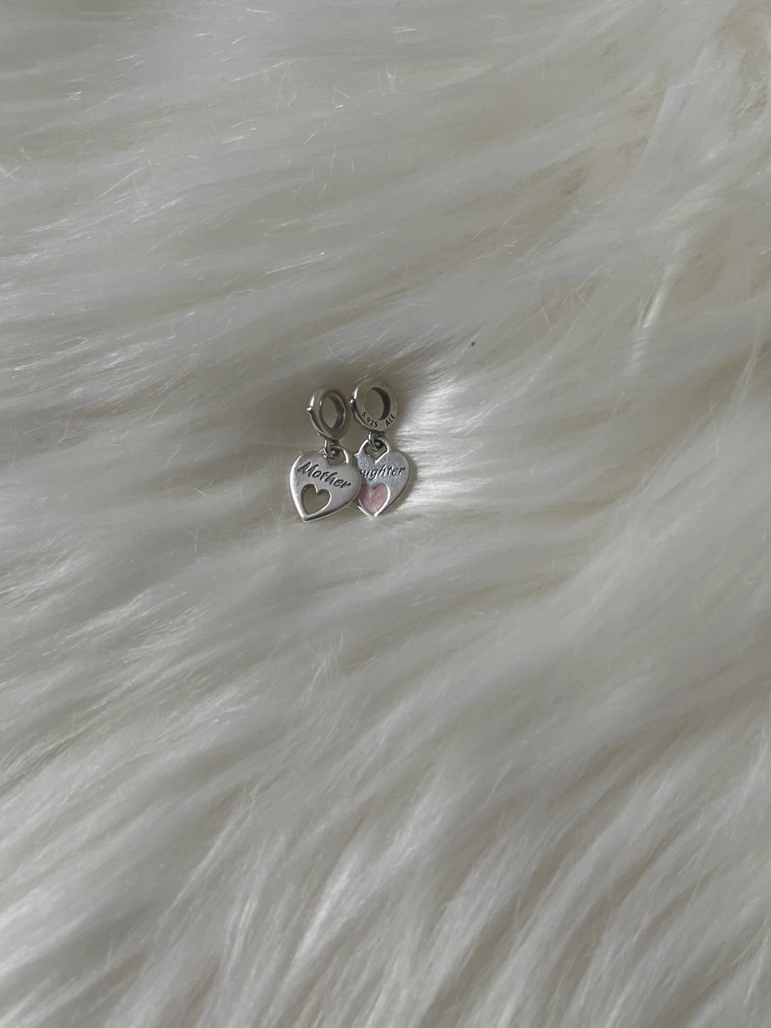 It’s in excellent used condition, just need a little bit cleaning but otherwise still shiny . Minimal sign of scratches from usual used 😃. Celebrate one of life’s most special bonds. One sterling silver disc includes a cut-out heart and is engraved with “In my heart” and “Mother”. On the other, a pink enamel heart with “Daughter” and “Forever”. When the discs overlap, the enamel heart fits perfectly within the cut-out. Beautiful silver heart charm with 'Mother' and 'Daughter' engravings. Features a pink heart accent. They’re retails at $90 + tax