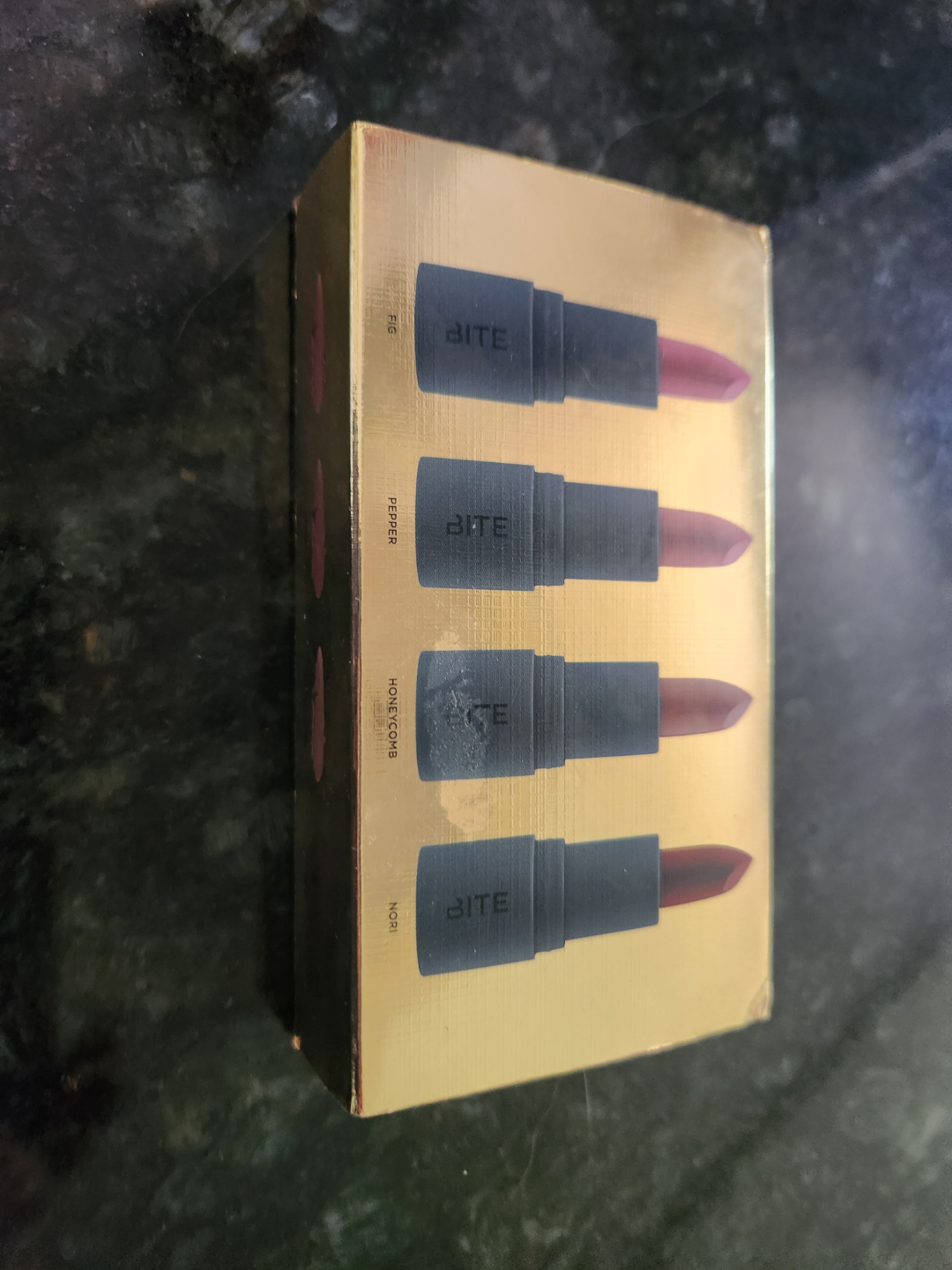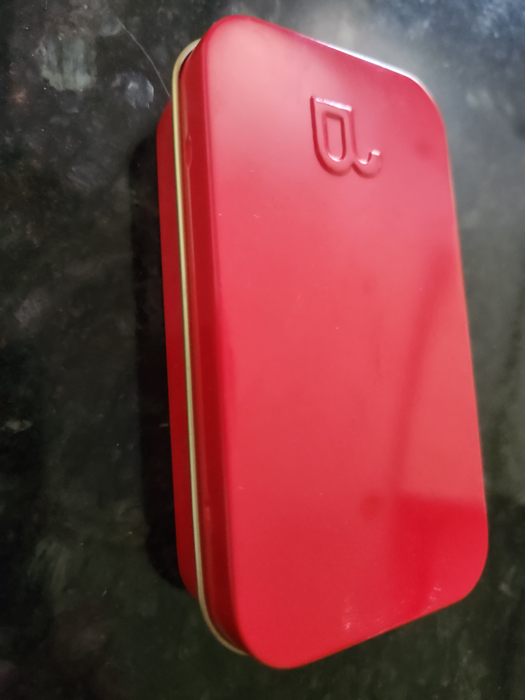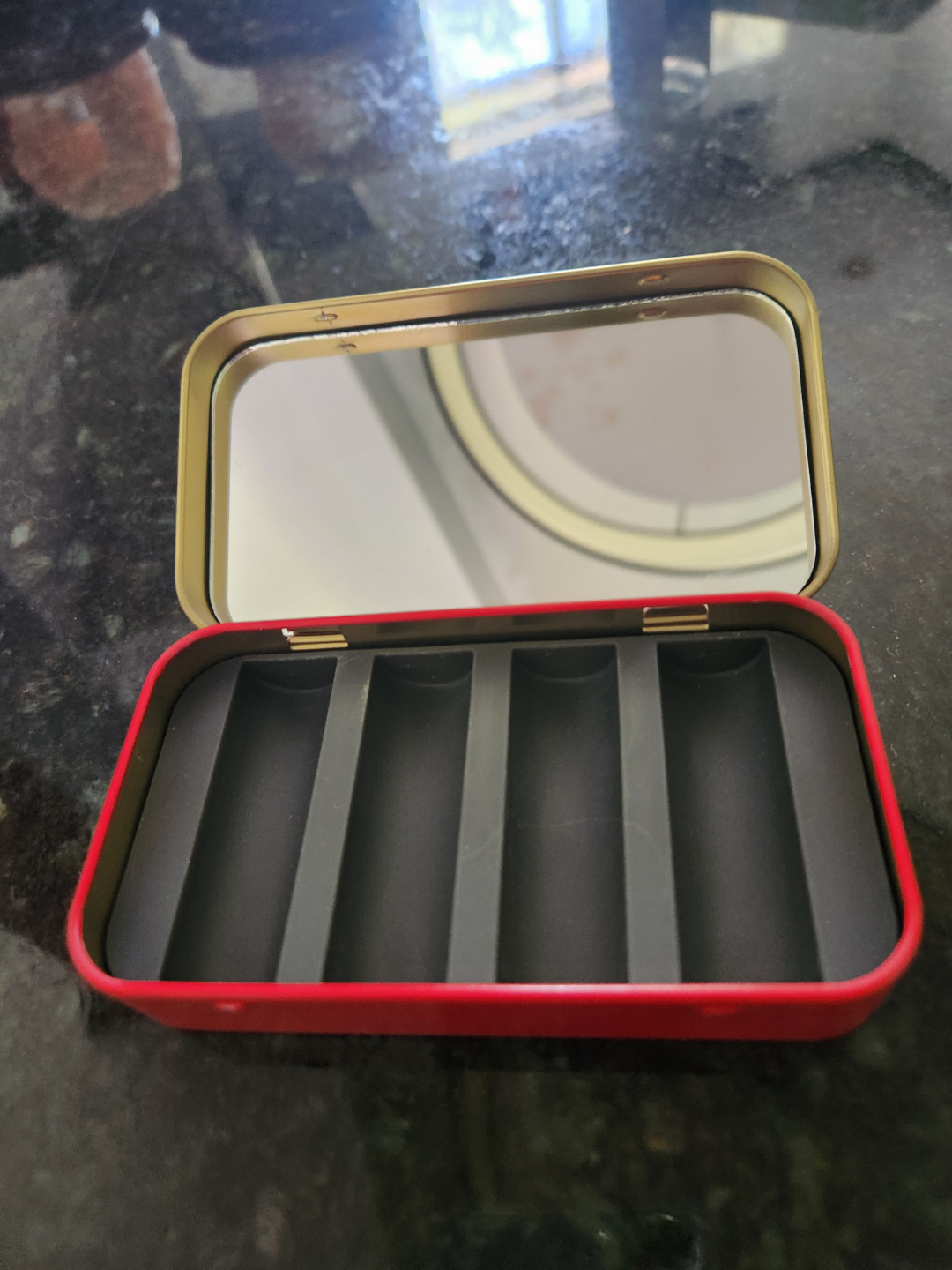 Empty box for four mini Bite Beauty lipsticks. Red metal travel tin with mirror. Perfect for travel or purse. Size 4.5" x 2.5" x 1"