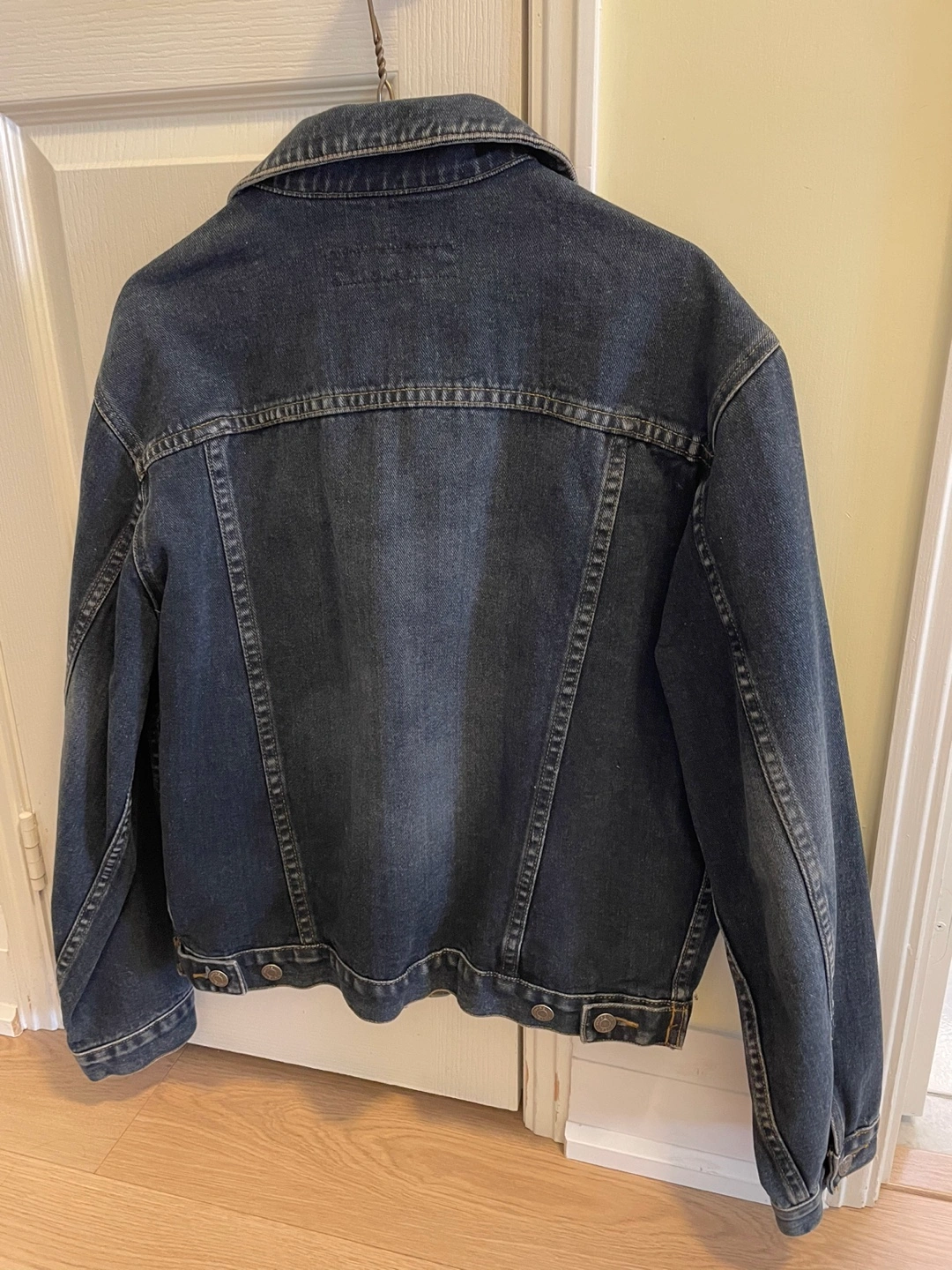Dark wash denim jacket. Classic style. Long sleeves. Button closure. Good condition.