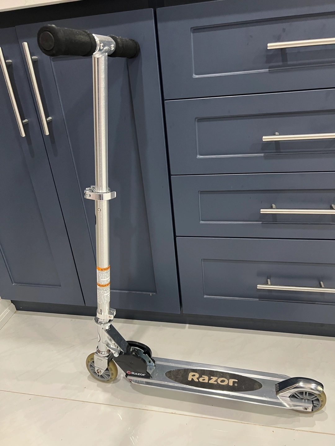 Aluminum frame. Good condition. Suitable for children. Features easy-to-adjust handlebar height and foldable. Durable wheels.