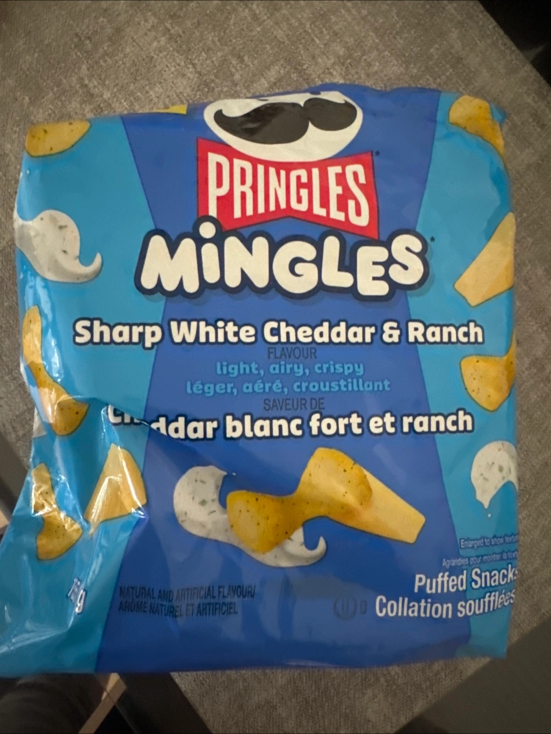 860Bag of Pringles Mingles puffed snacks. Sharp White Cheddar & Ranch flavour. Light, airy, crispy. New and unopened. BB: June 14 2025